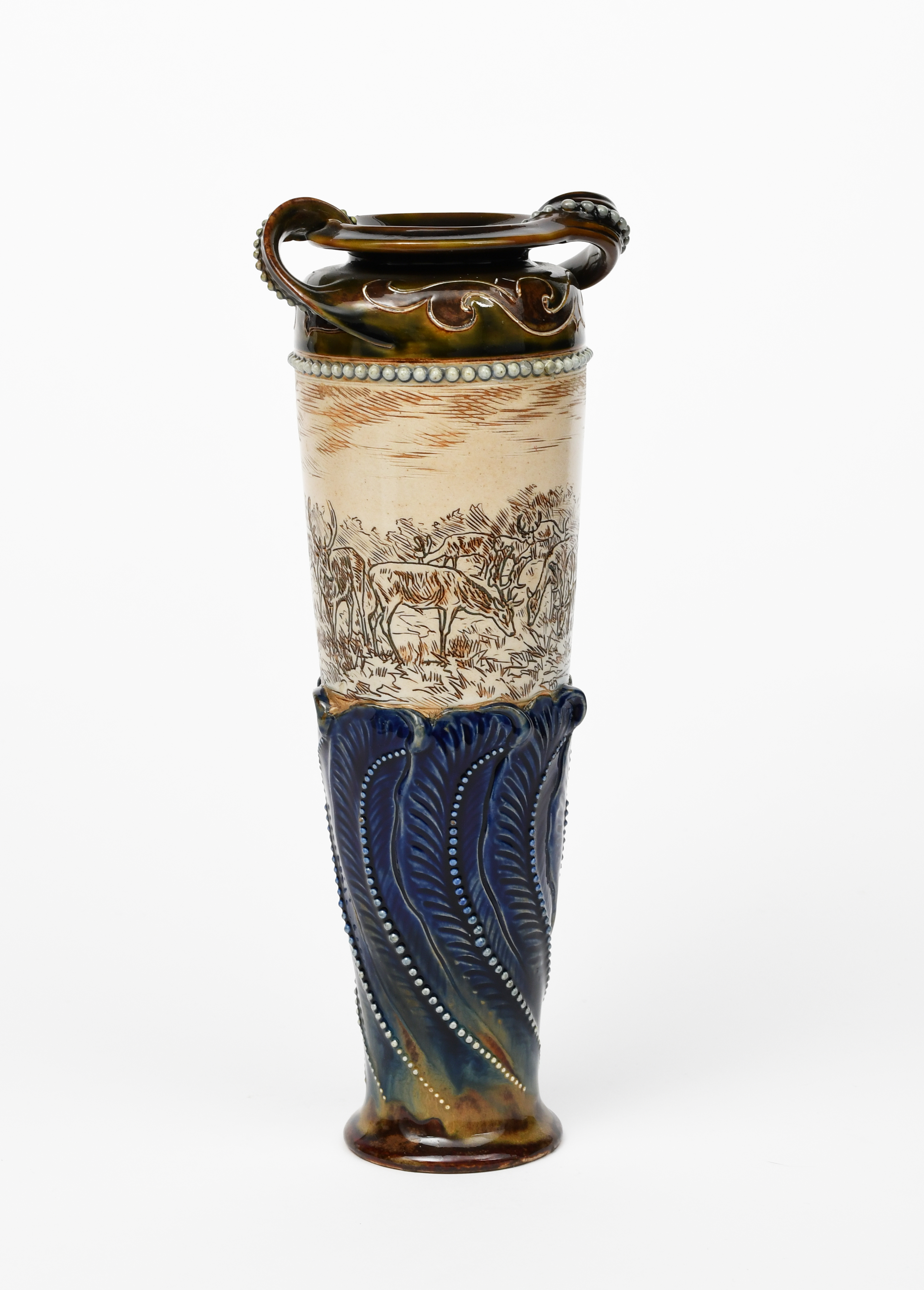 An unusual Royal Doulton stoneware vase by Hannah Barlow and Frank Butler, slender, cylindrical form with modelled fern frond band and scroll-handles applied with beadwork, incised with a herd of deer grazing and resting in a woodland setting, in colours on a buff ground, impressed factory mark, incised monograms, professional restoration to neck, 32cm. high