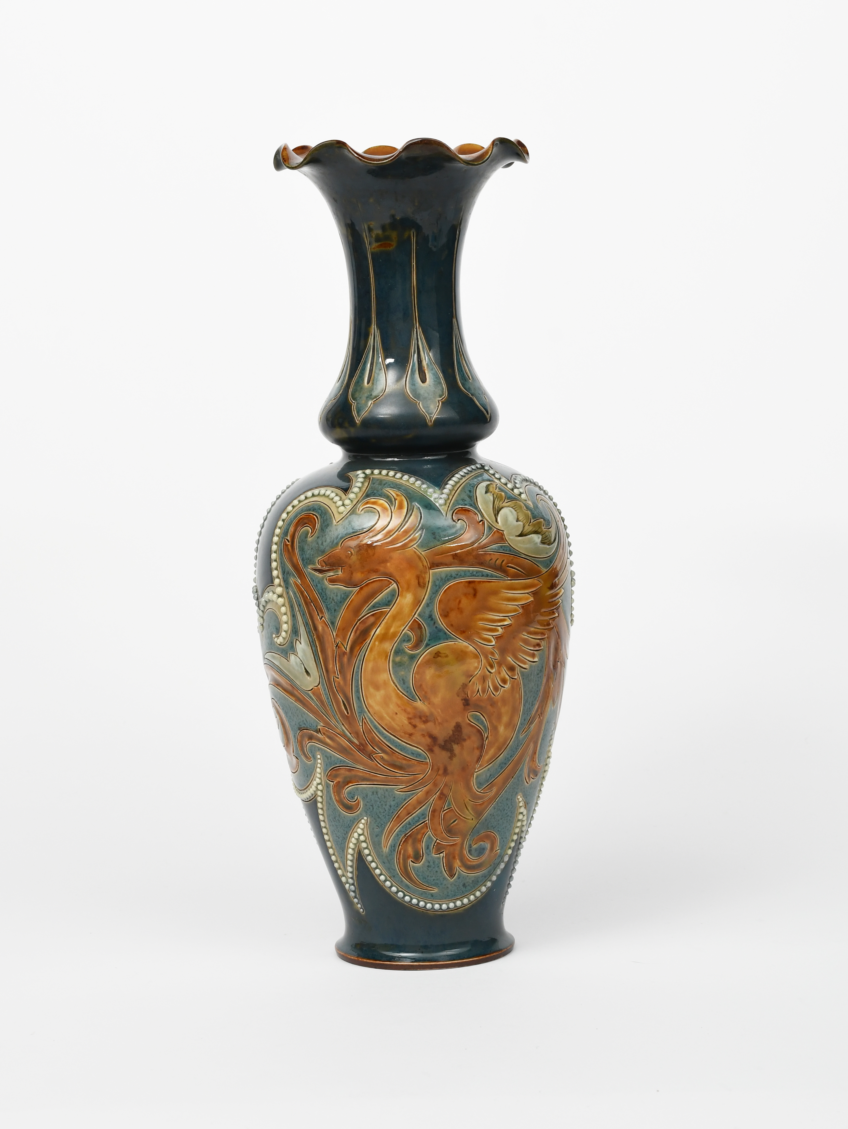 A tall Art Nouveau Doulton Lambeth stoneware vase by Eliza Simmance, shouldered baluster form with waisted neck and fluted top rim, incised with a phoenix bird inside scrolling foliage and applied beadwork borders, glazed buff, green and white on a blue ground, impressed factory mark, incised artist monogram, professional restoration, 41.5cm. high