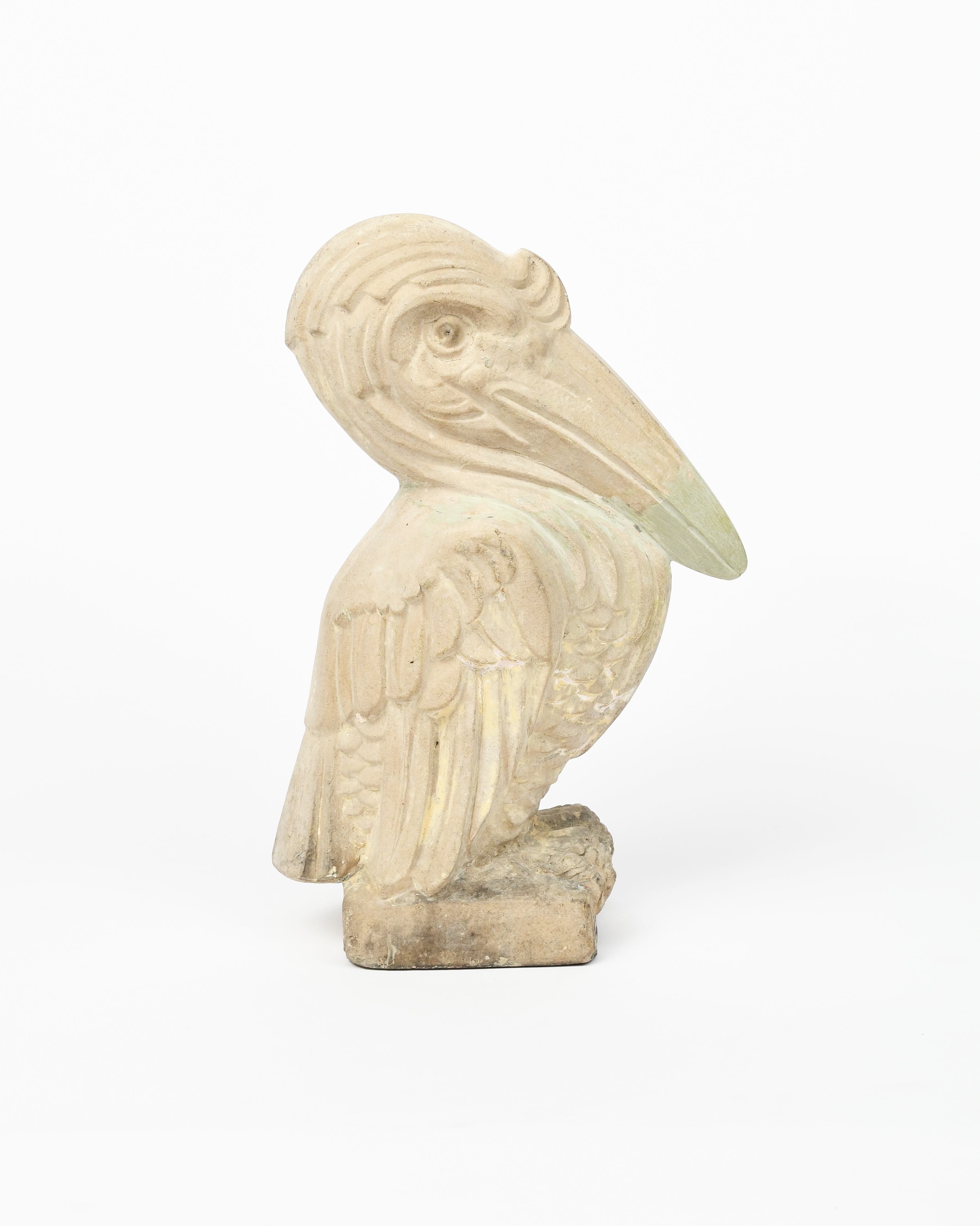 A Royal Doulton stoneware Pelican garden ornament, modelled perched on a square base, unglazed,