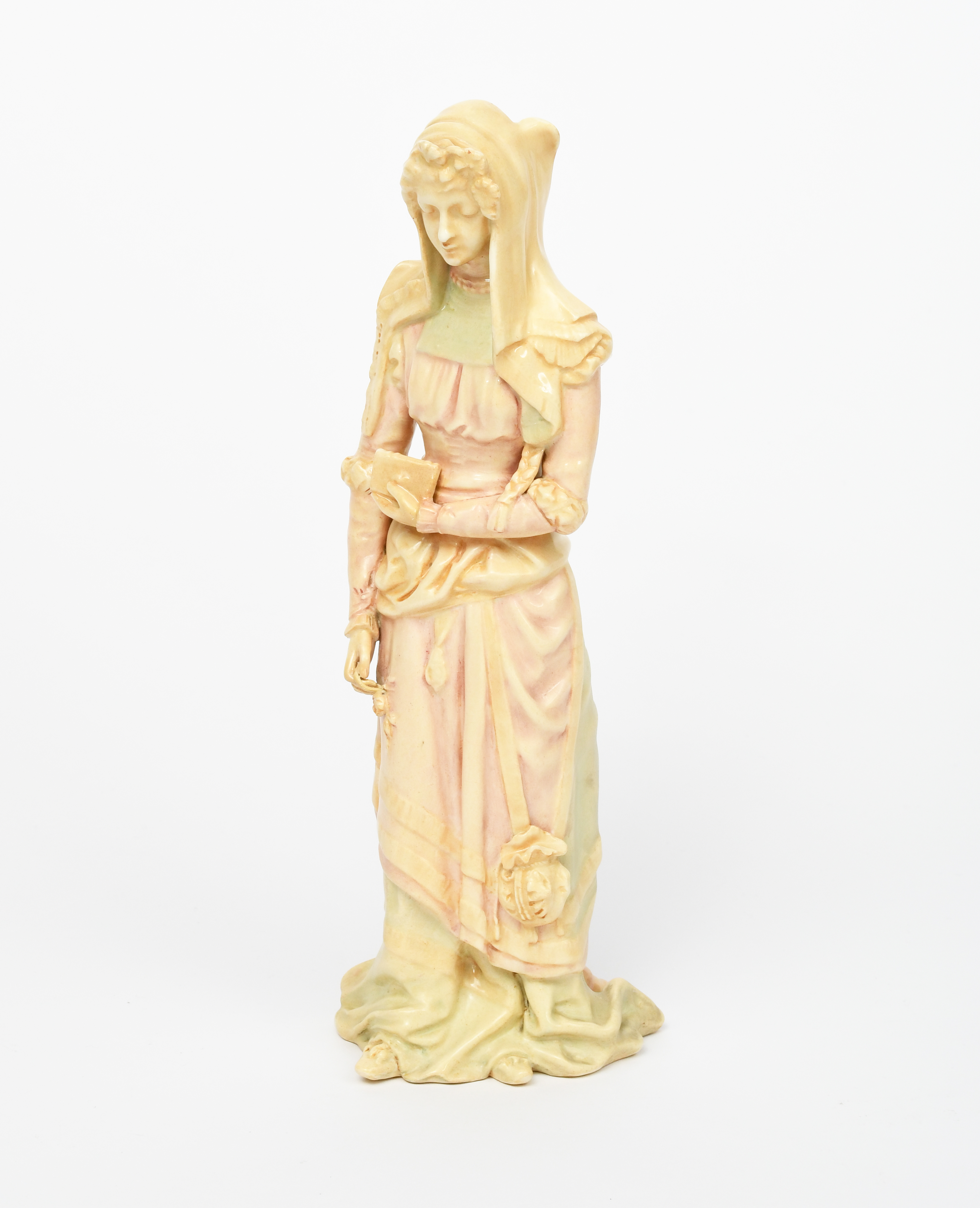 Mephistopheles and Marguerite a rare Doulton Burslem vellum figure designed by Charles Noke, reversible figure, glazed in colours, highlighted in gilt, unsigned, flat chip to base, professional restoration to her hand, 31.5cm. high