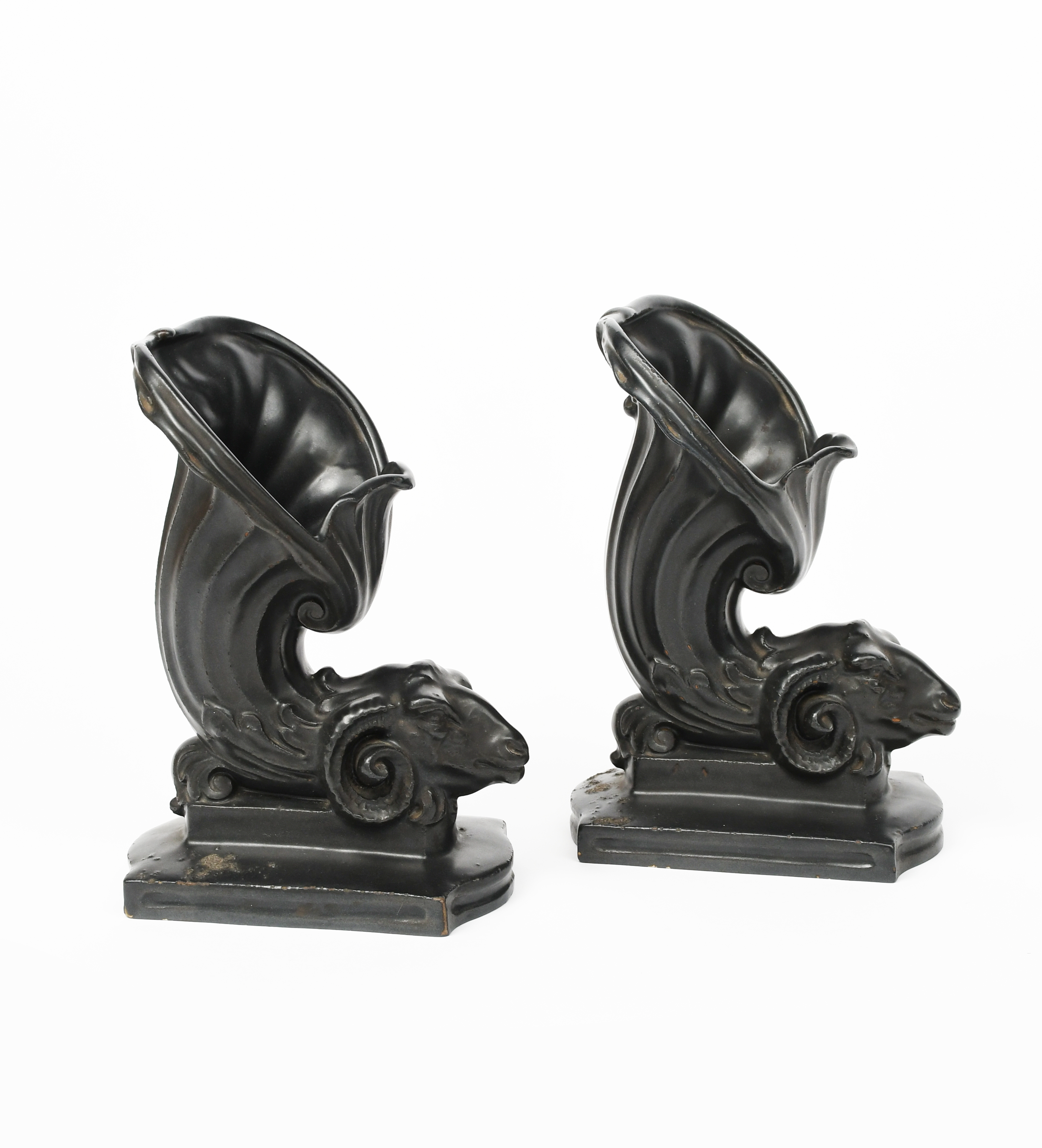 A pair of Royal Doulton stoneware cornucopia vases designed by Franics Pope, on shaped rectangular base the cornucopia with Rams head terminal, glazed black, impressed marks, incised FCP, 24cm. high, (2)