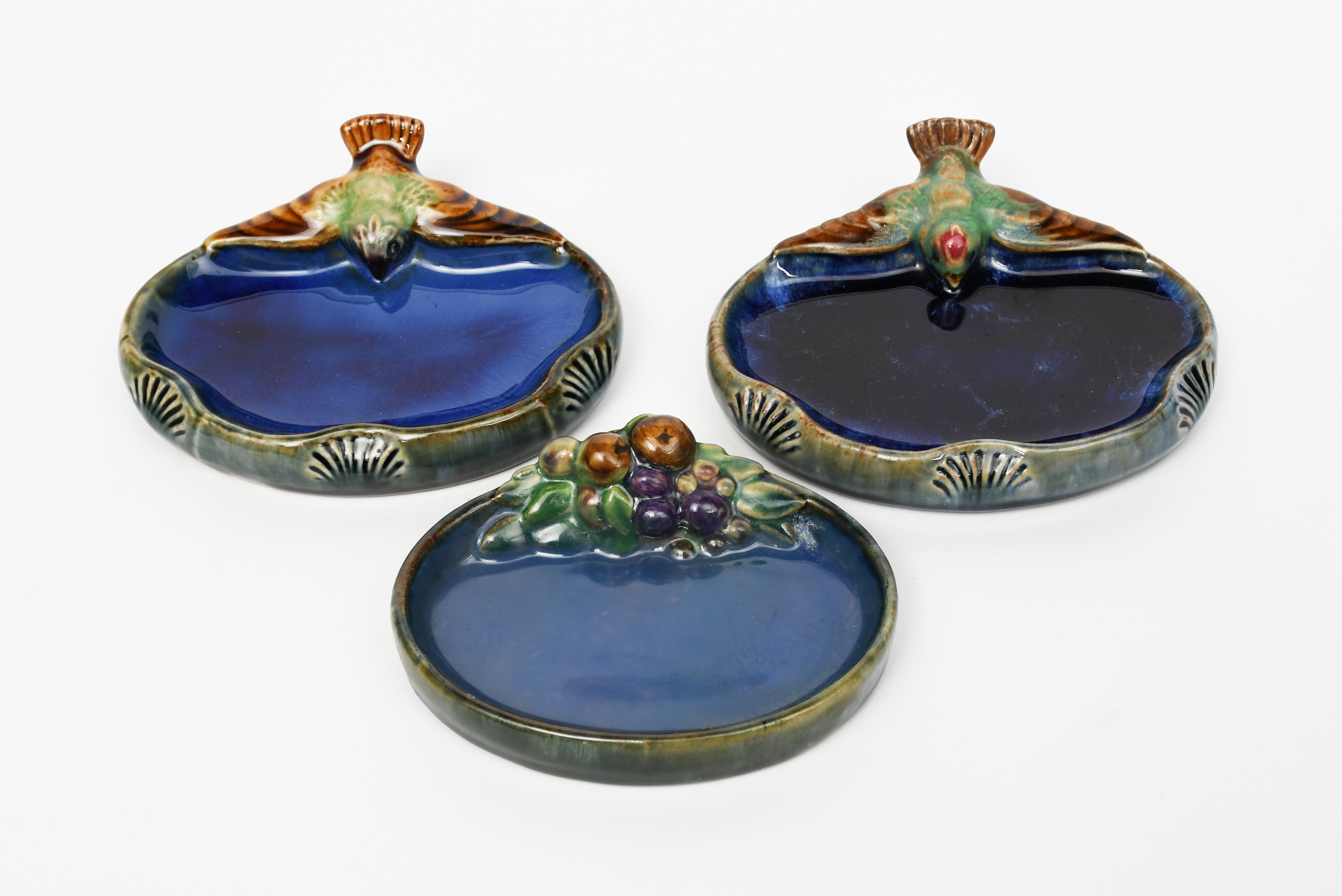 A Doulton Lambeth stoneware Bird bibelot designed by Harry Simeon, modelled flying over an oval dish, glazed in colours, another similar and a Doulton bibelot with fruit and foliage design, impressed marks, fruit bibelot restored, 15cm. wide. (3)