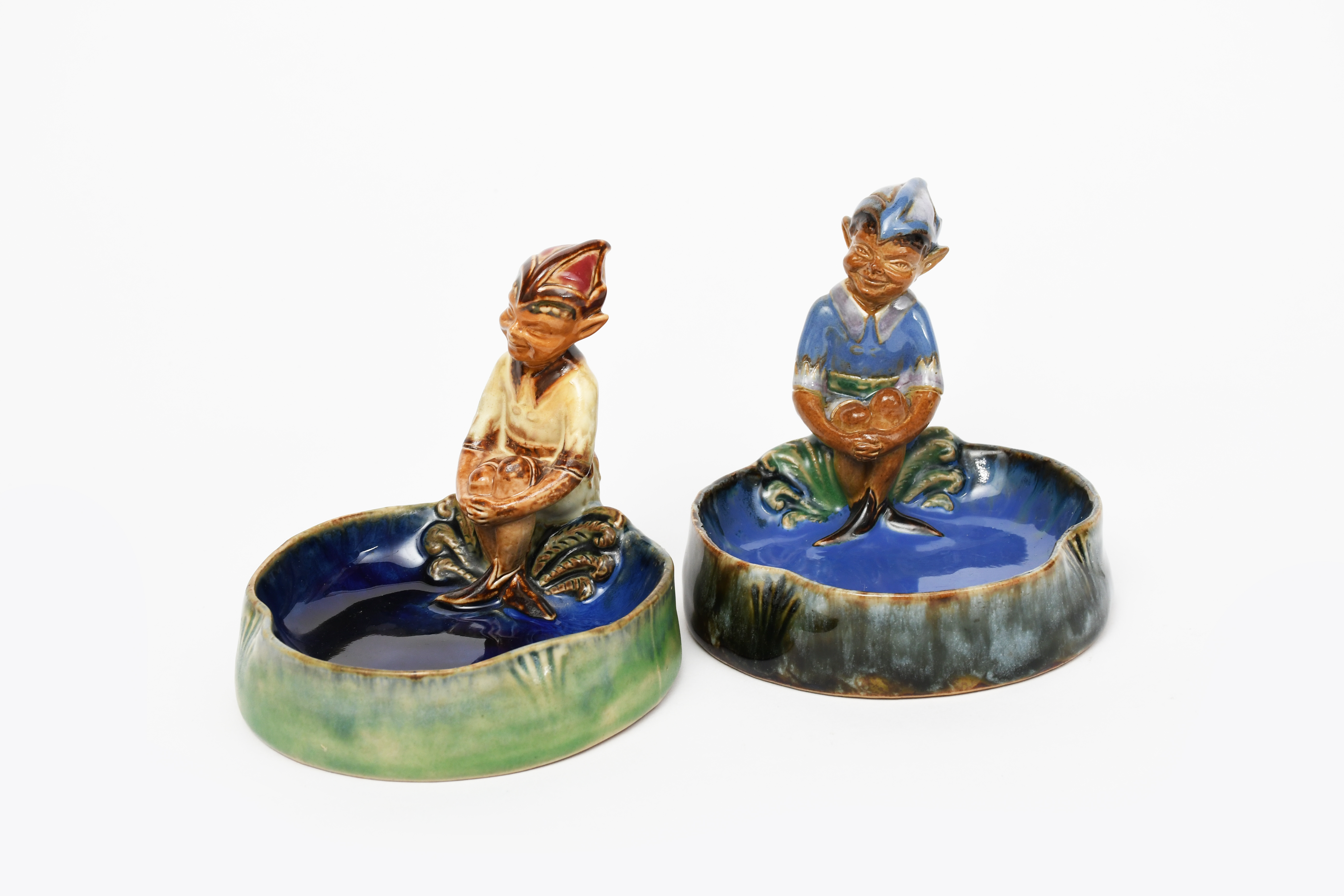 A Doulton Lambeth stoneware Pixie bibelot designed by Harry Simeon, glazed in colours, and another similar, impressed factory marks, restored, 10.5cm. high (2)