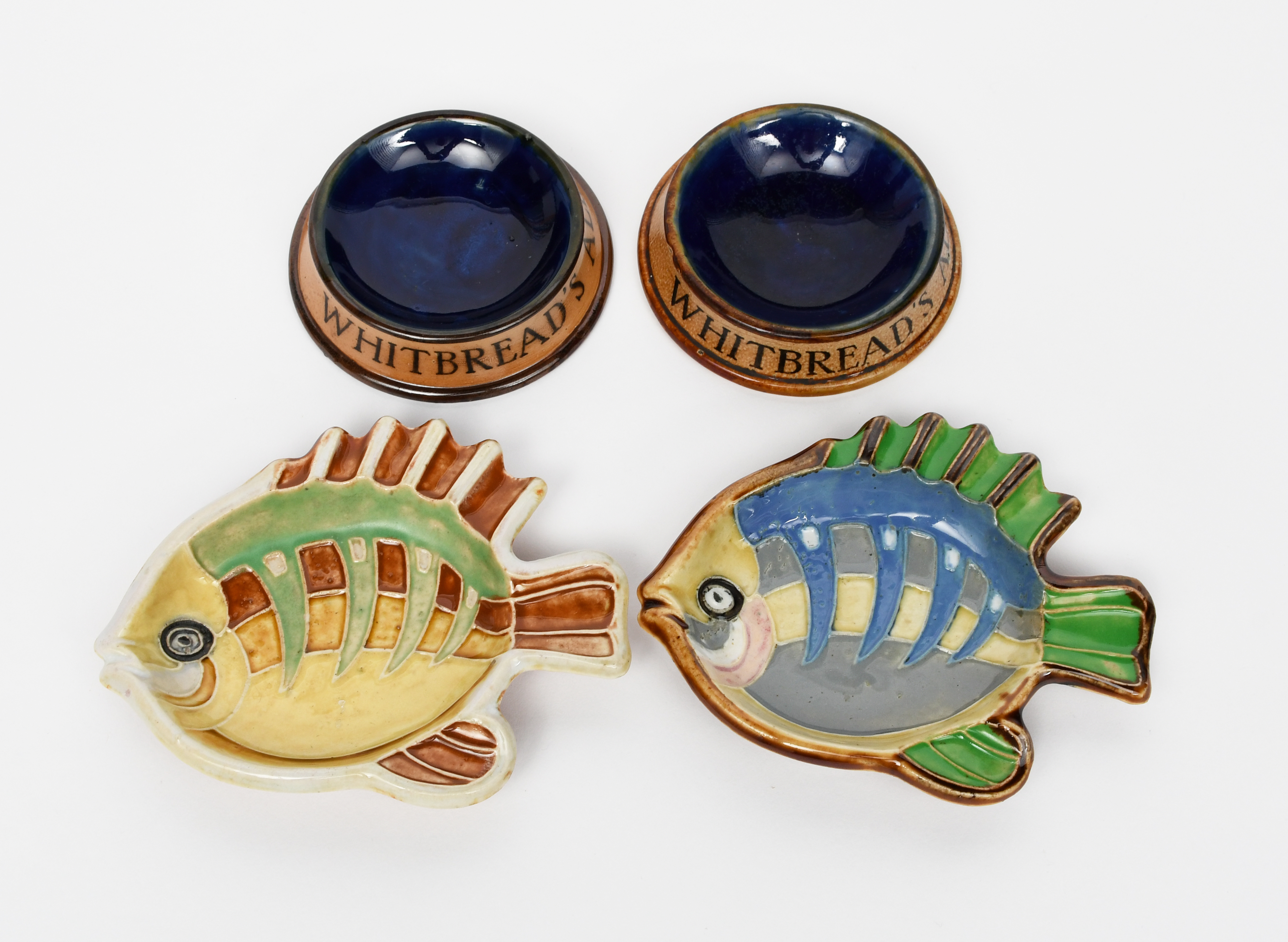 A pair of Doulton Lambeth stoneware Fish bibelot designed by Harry Simeon, glazed in colours, and two Royal Doulton stoneware Whitbread ashtrays, impressed marks, 15.5cm. wide (4)