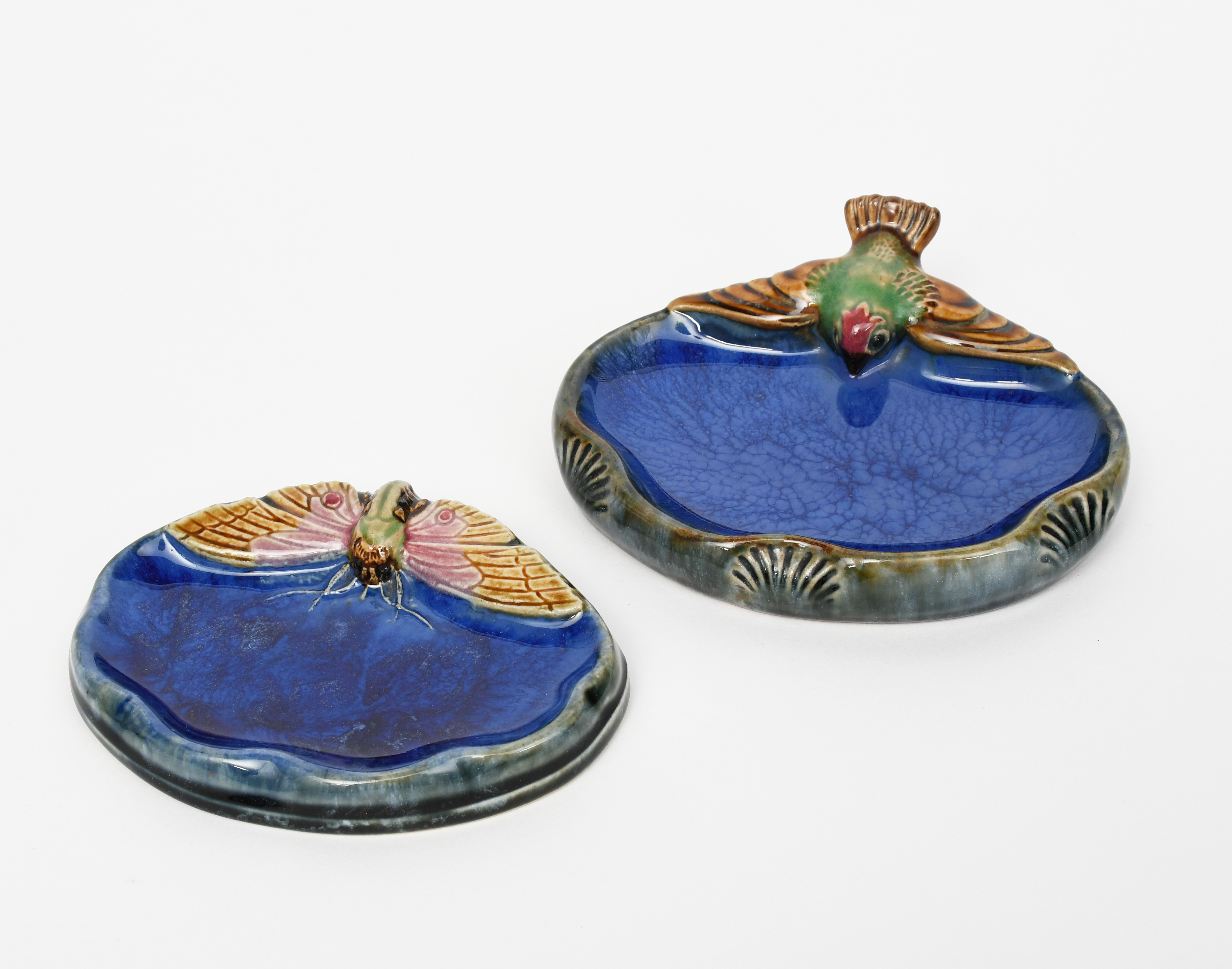 A Doulton Lambeth stoneware Moth bibelot designed by Harry Simeon, modelled as a moth on elliptical dish, glazed in colours, and another Doulton Lambeth stoneware bibelot modelled with a bird flying, impressed marks, 15cm. wide. (2)