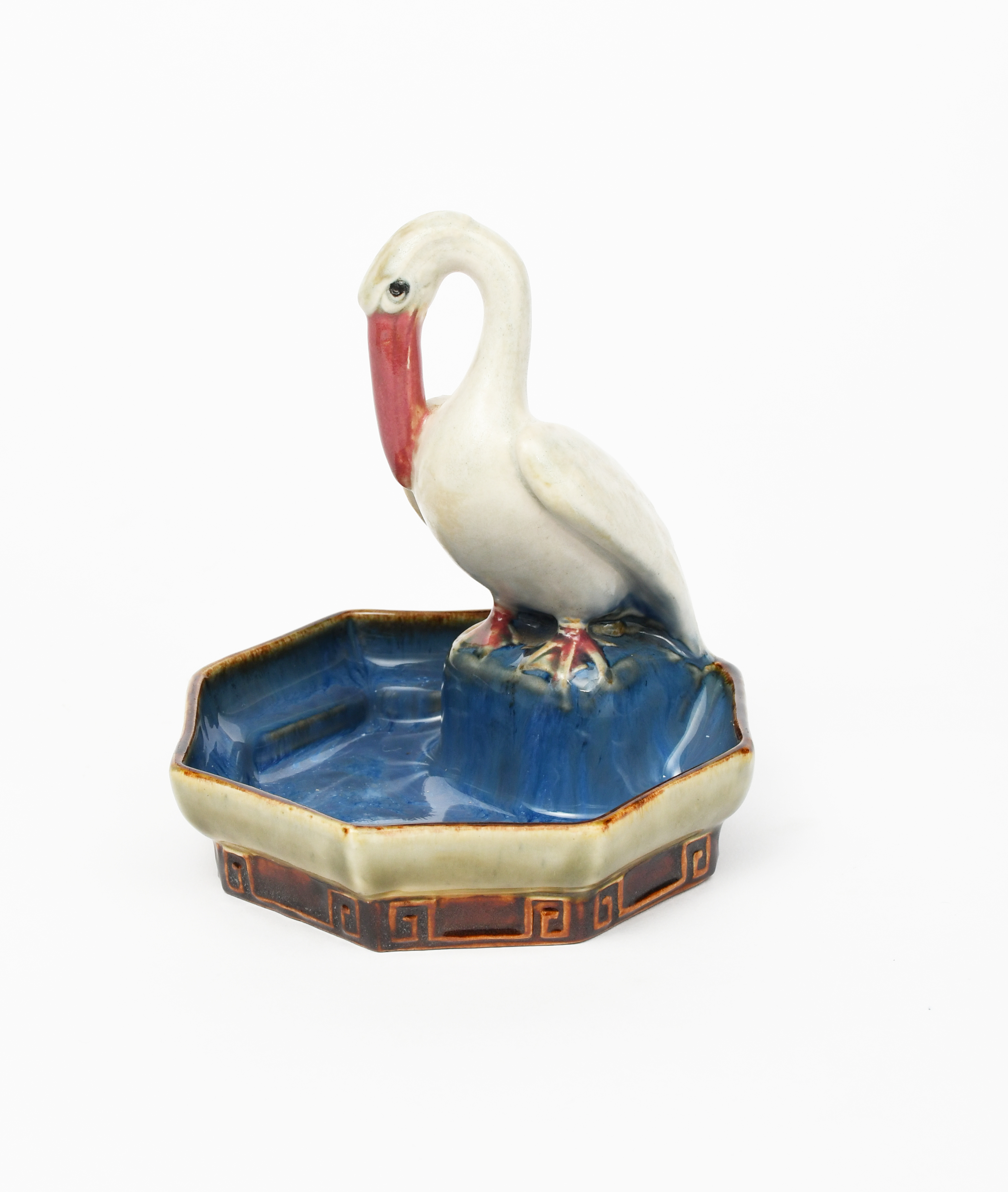 A Doulton Lambeth stoneware Pelican bibelot designed by Harry Simeon, modelled perched on an octagonal base, glazed in colours impressed marks, 13.5cm. high