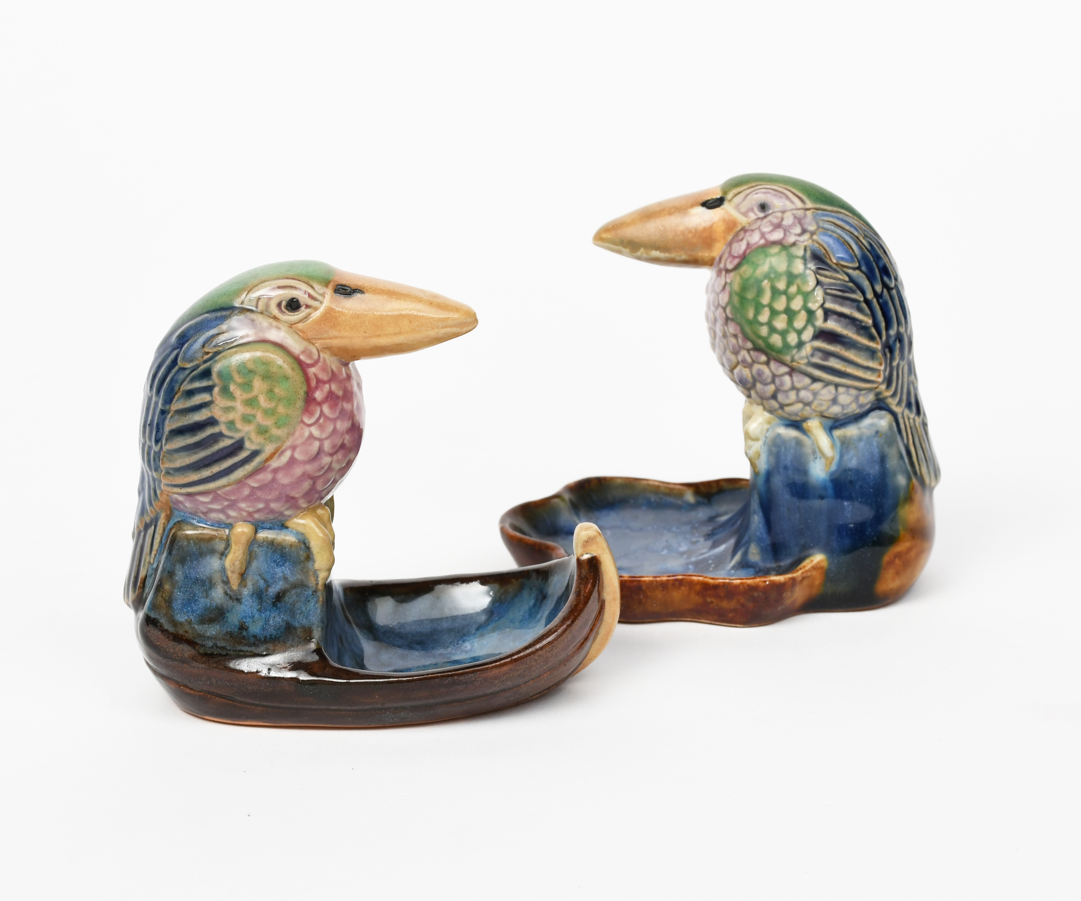 A Doulton Lambeth stoneware Kookaburra bibelot designed by Harry Simeon, modelled perched on a boat, glazed in colours, and another Doulton Kookaburra bibelot, impressed marks, second bibelot restored, 11cm. high (2)