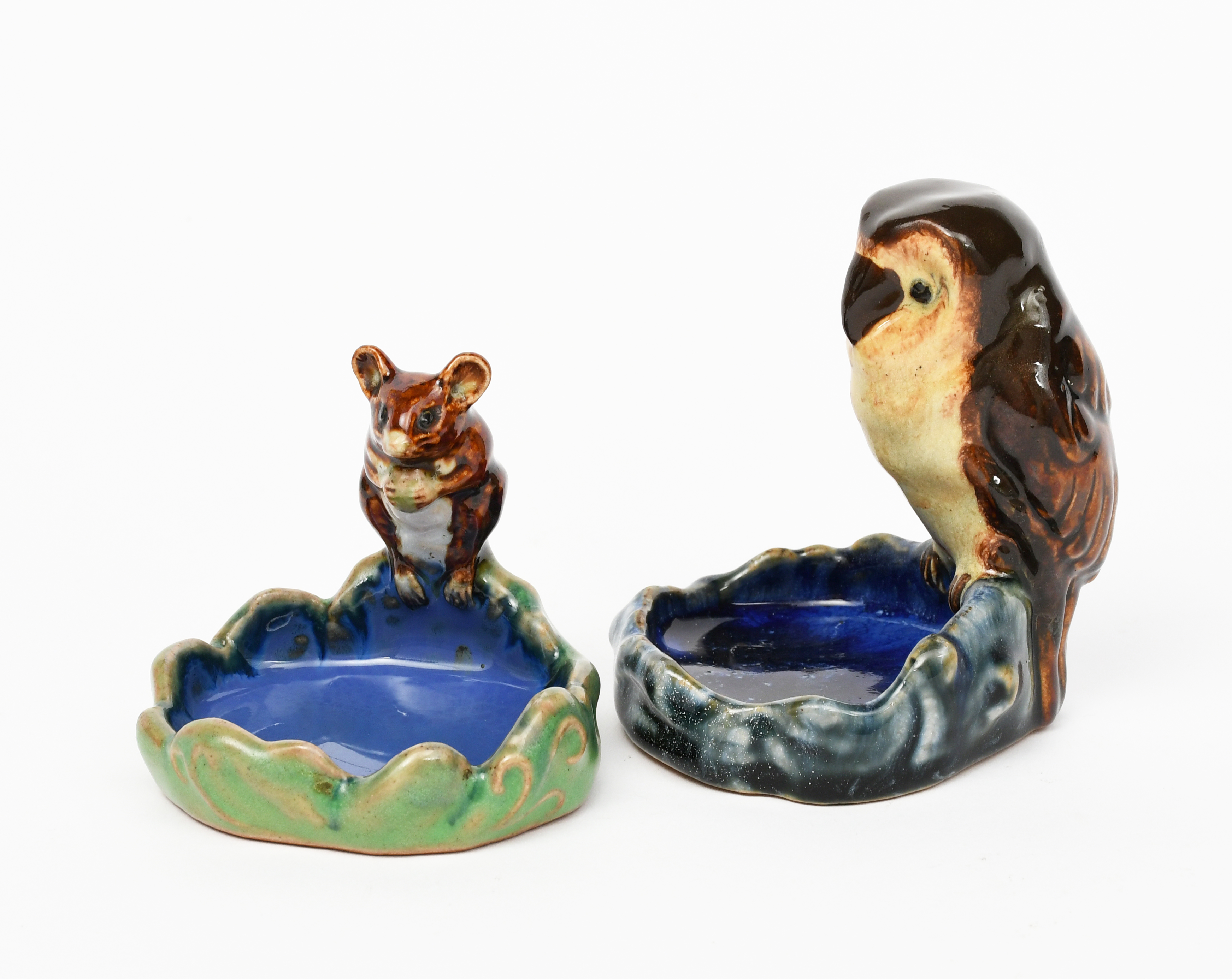 A small Doulton Lambeth stoneware Mouse bibelot designed by Harry Simeon, glazed in colours, and a Doulton Lambeth stoneware owl bibelot, impressed marks, owl restored, 7.5cm. high (mouse), (2)