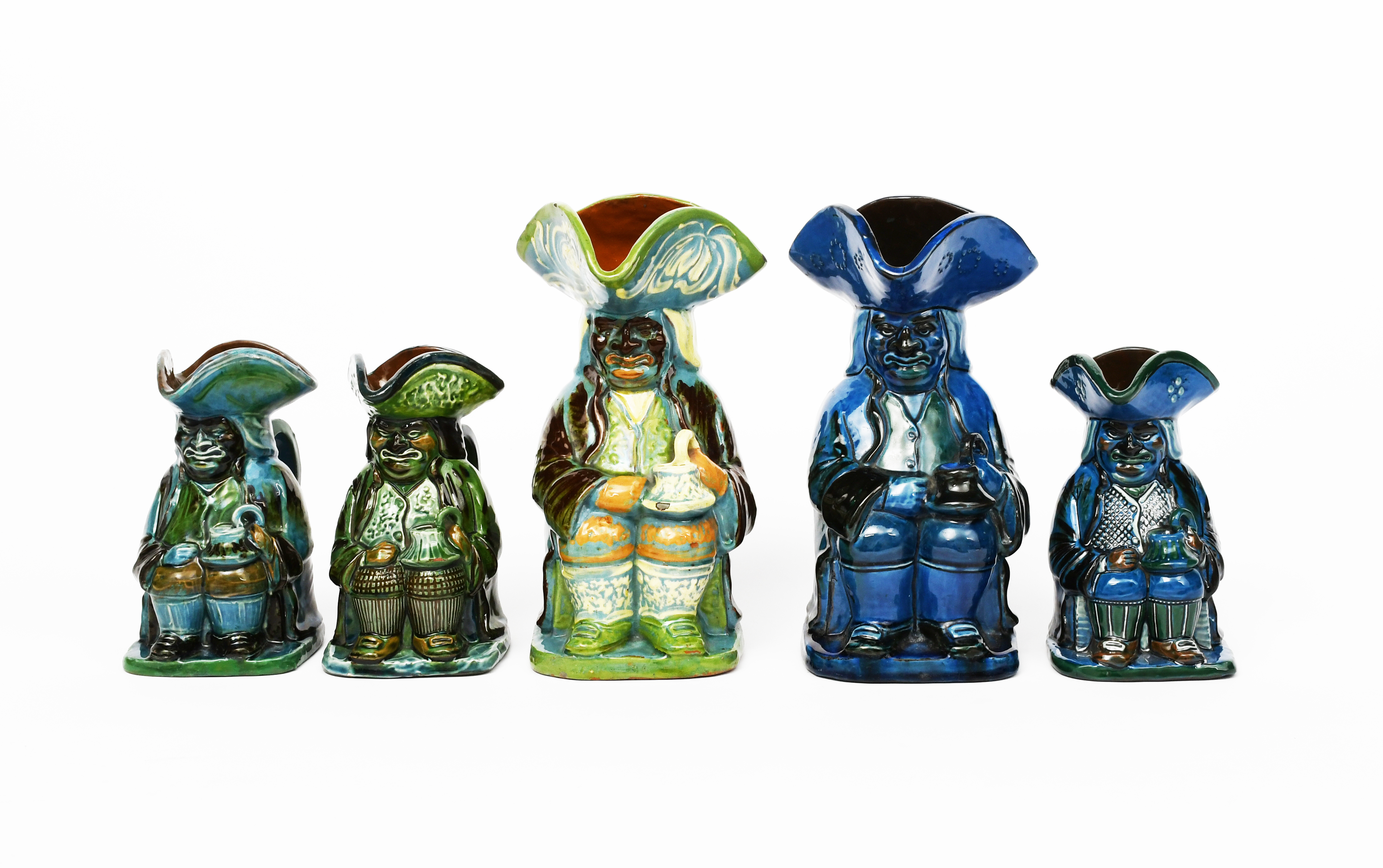 A C H Brannam Barum Toby jug, dated 1900, glazed in shades of green, yellow, blue and brown, and four others similar, incised marks, restoration, 22.5cm. high, (5)