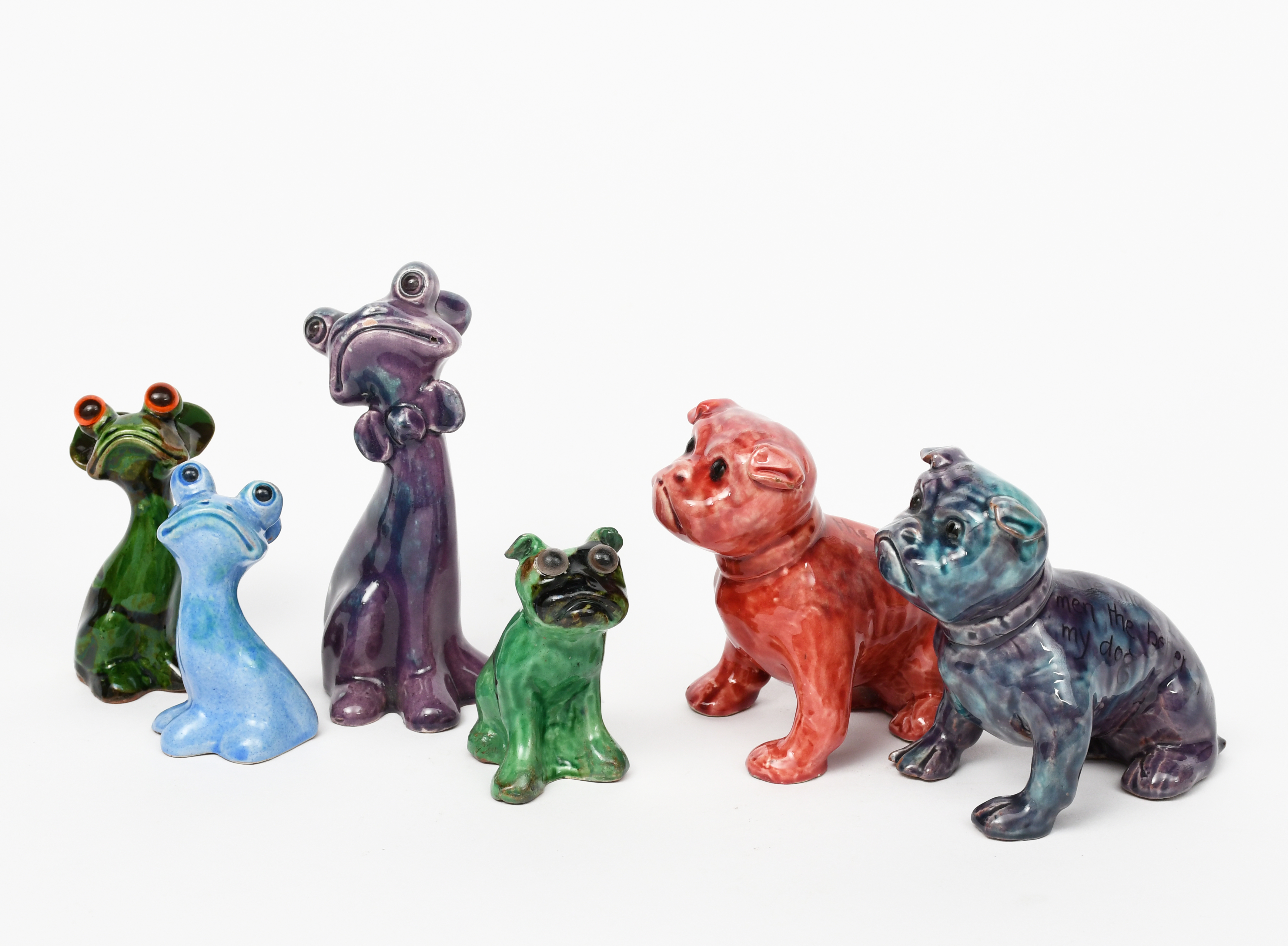 A Baron Pottery model of a comical animal the design attributed to Blanche Georgiana Vulliamy, modelled seated and wearing a bow tie, glazed purple and lavender, three others similar, and two seated bulldogs, incised marks, 14cm. high (6)