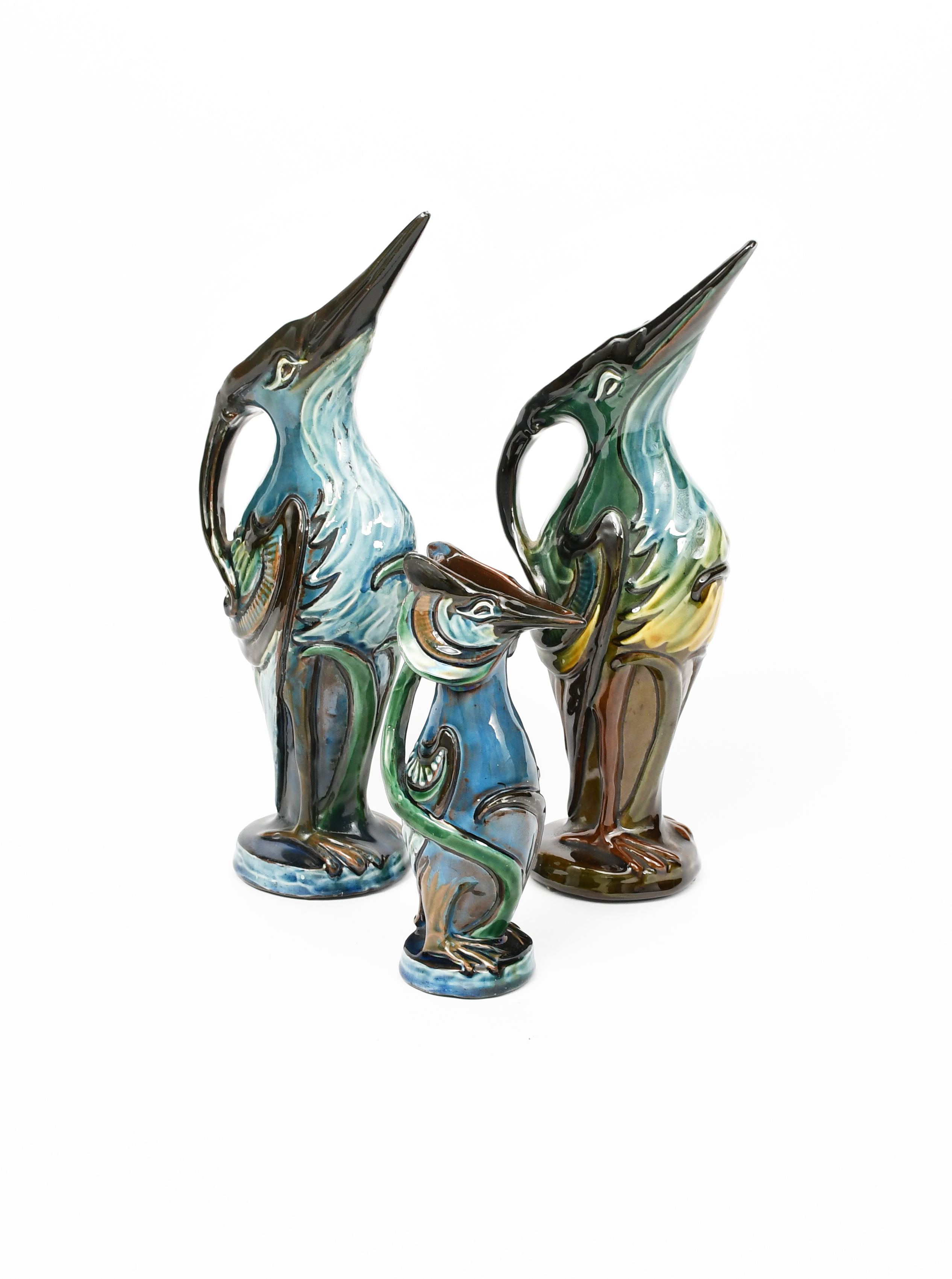 Two graduated C H Brannam bird jugs, each modelled as a stylised wading bird, glazed in colours, and another smaller incised marks, restored, 26.5cm. high (3)