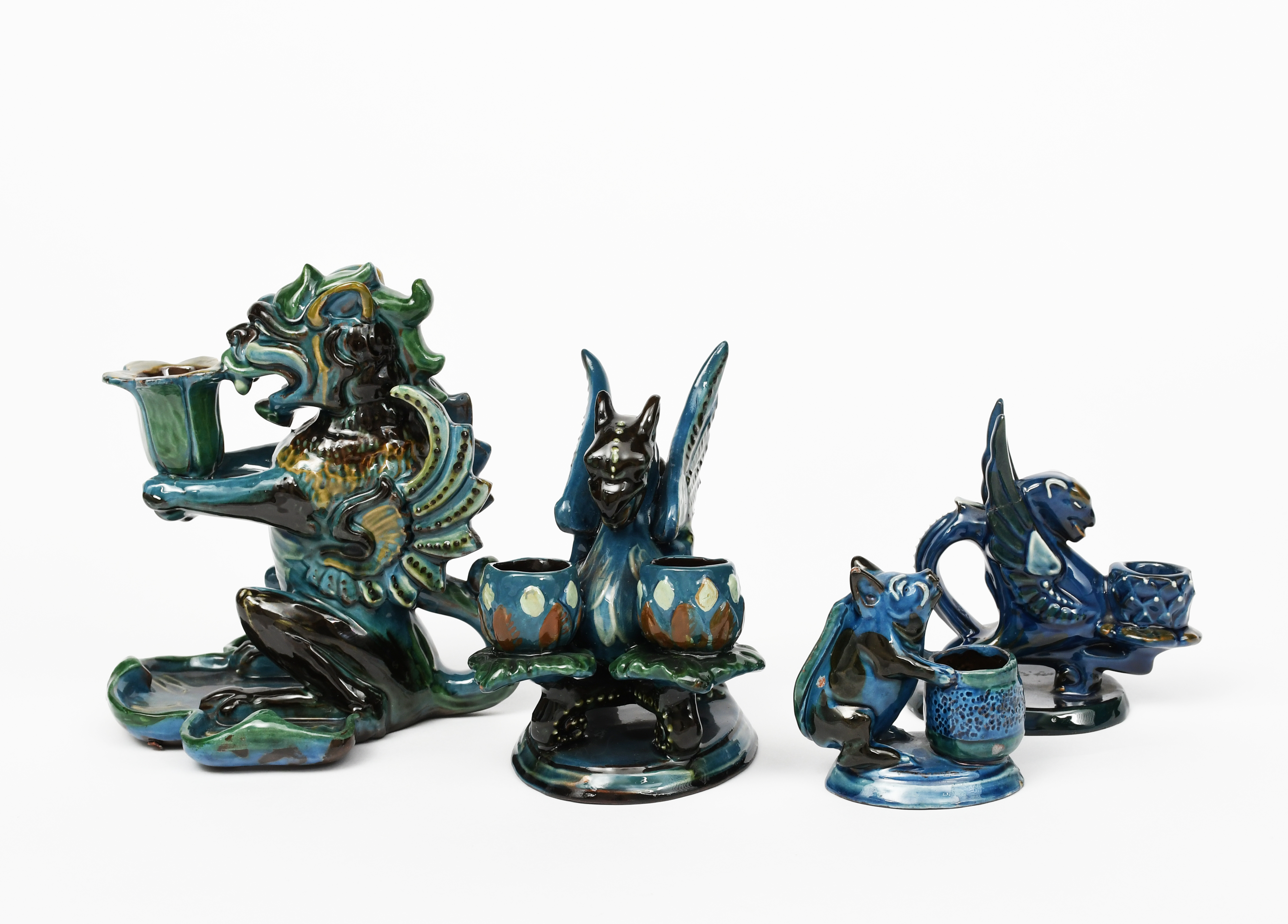 A large C H Brannam Barum Ware Dragon chamberstick, dated 1917, glazed in colours, another similar with twin sconces, a smaller chamberstick and a small vesta modelled as pig standing by a barrel, incised marks, restored, 18cm. high (4)