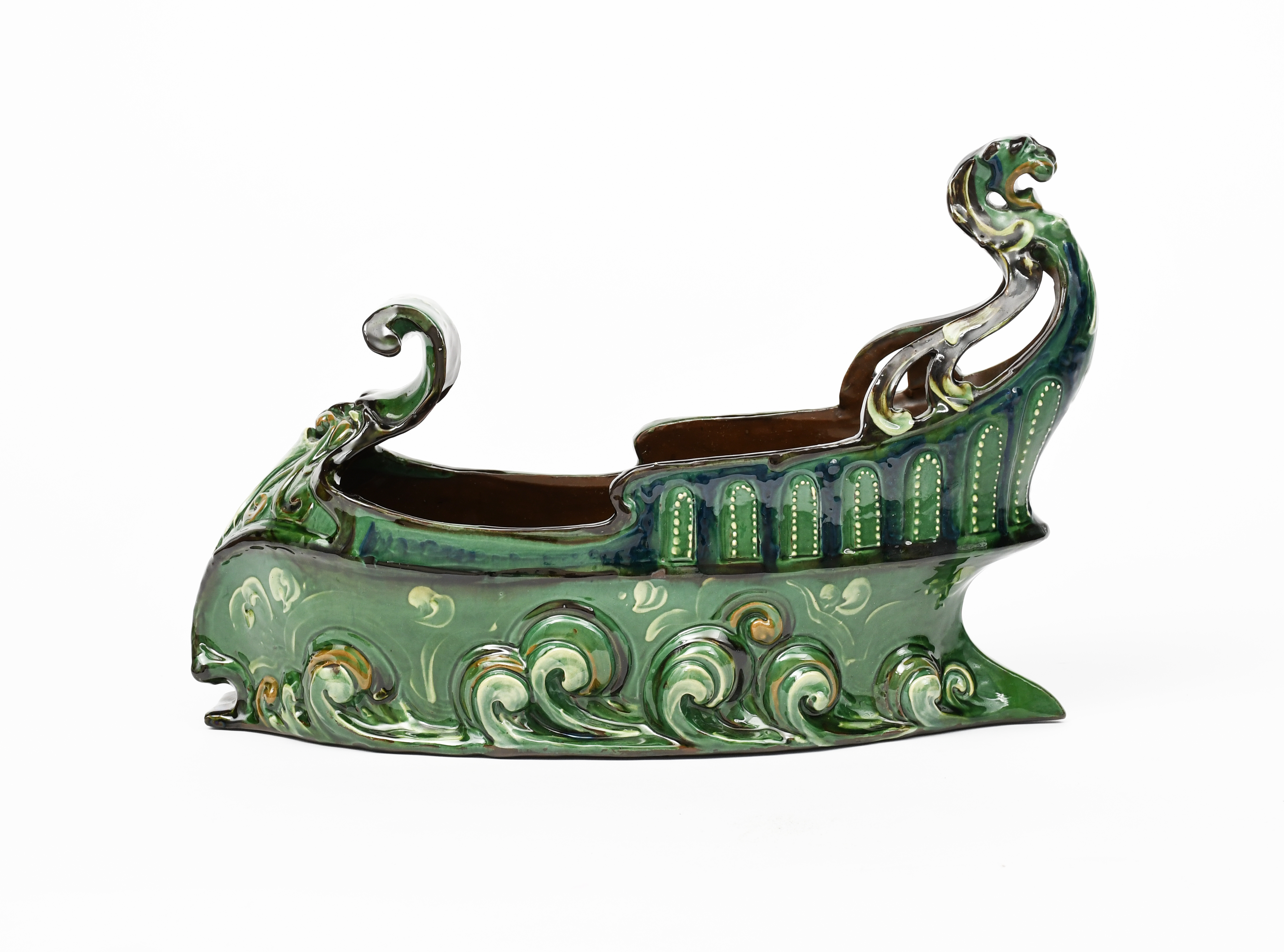 A large C H Brannam Barum Ware pottery boat centrepiece by Reginald Pearce, dated 1903, pierced and modelled with a mask figurehead, the stern with lion head profile, glazed blue and white on a green ground, incised marks, professional restoration, 36cm. wide, 26.5cm. high