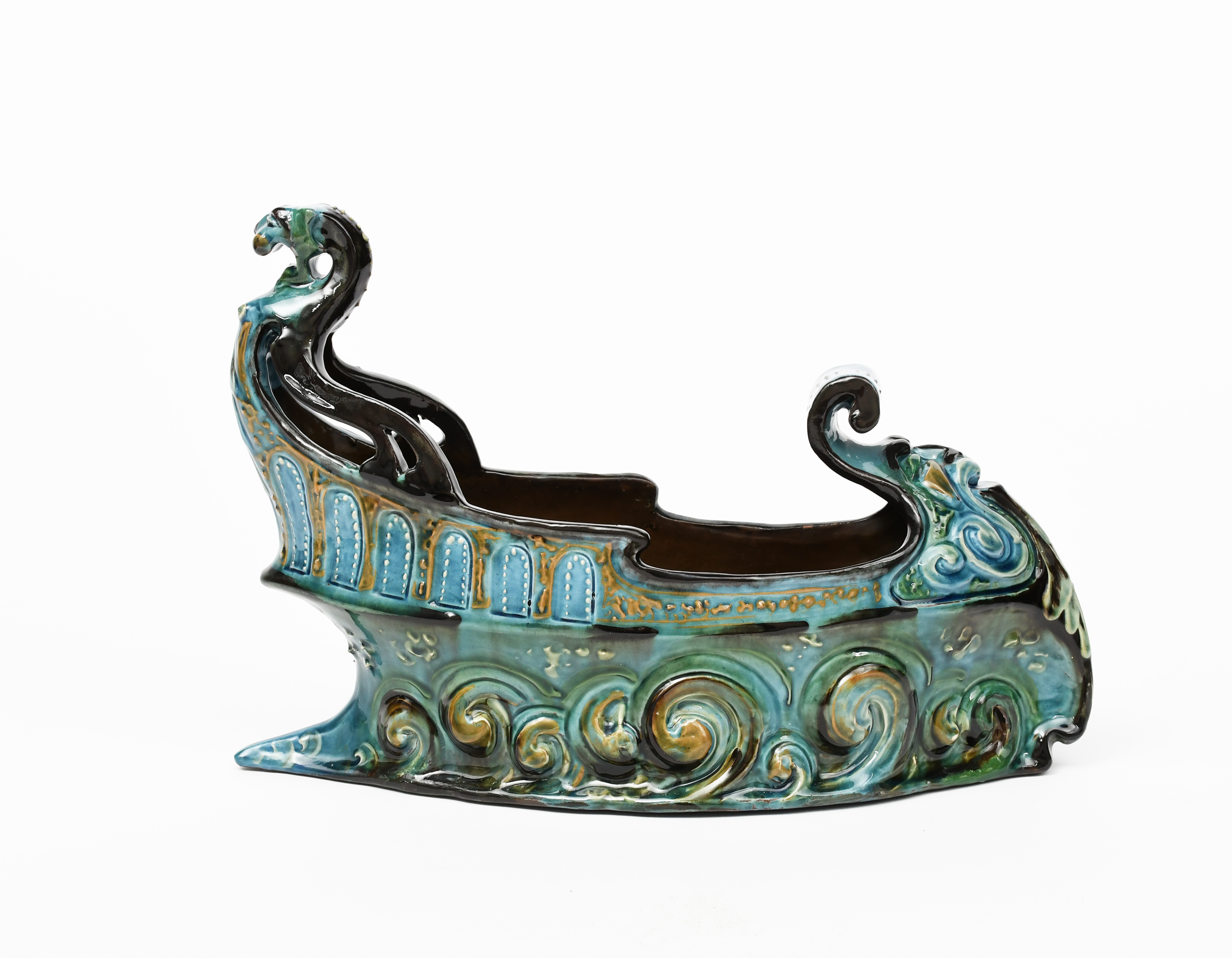 A C H Brannam Barum Ware pottery boat centrepiece by Thomas Liverton, dated 1901, modelled on rough sea with mask figurehead, the stern modelled with lion head terminal, in shades of blue, green and ochre, incised marks, restored, 29cm. wide, 21cm. high