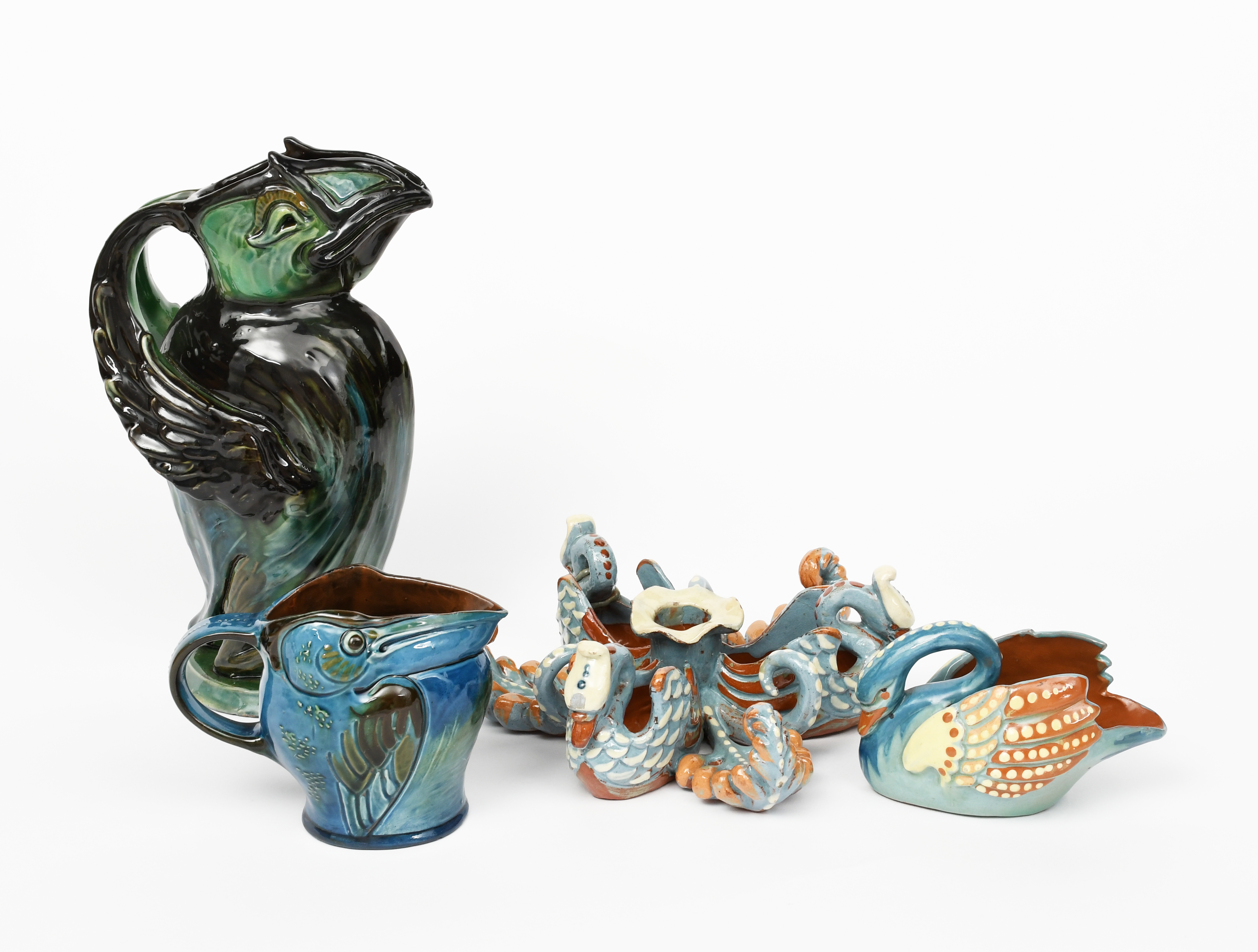 A C H Brannam Barum Ware Puffin jug, probably retailed by Liberty & Co, dated 1900, modelled and glazed in green and ochre, another smaller jug, a centrepiece modelled as three radiating swans, from a central candle sconce, and a swan vase, incised marks, restored, 25cm. high (4)