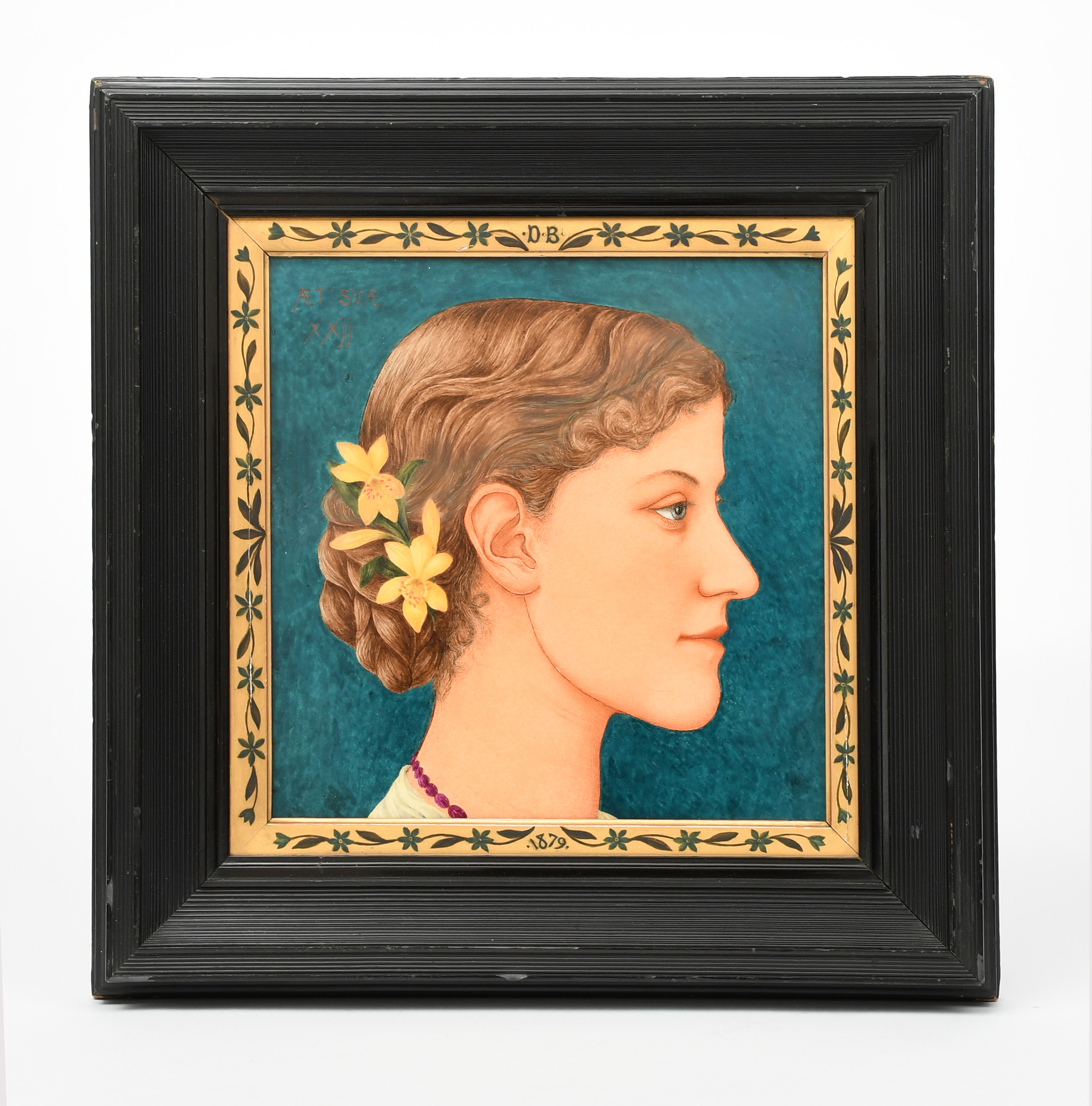 A Howell and James Art Pottery Exhibition large tile plaque, painted with a portrait of a lady, in colours, in an ebonised wood frame, applied paper label, annotated P158, professionally restored, 27.5cm square (tile), 44cm. square (frame)