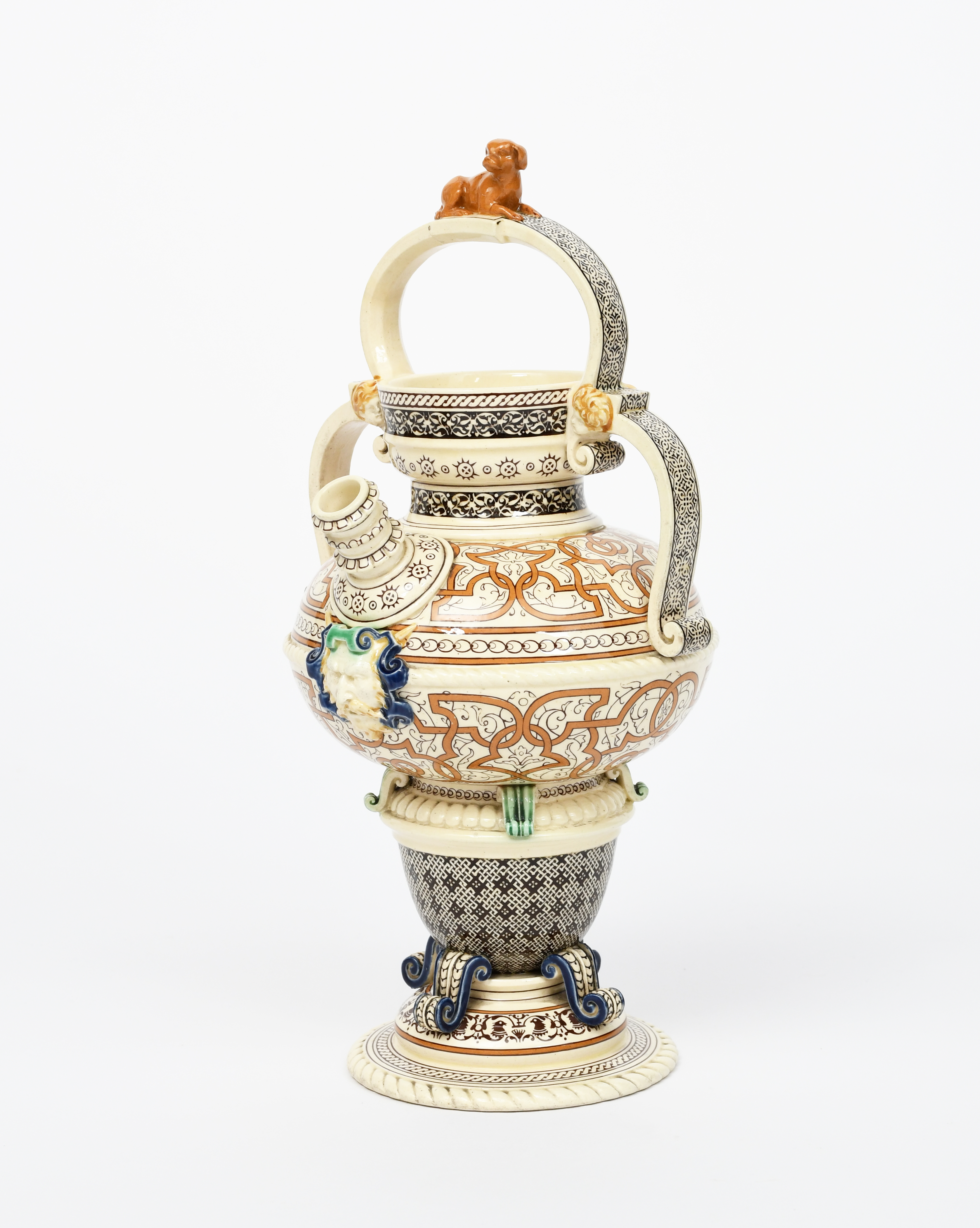A Minton & Co Henri Deux ewer by Charles Toft, stepped foot with applied scrolls supporting waisted body, the arched handle with moulded dog terminal, cast mask below angled, short spout, painted in colours printed and painted marks, professional restoration to handle, 27cm. high