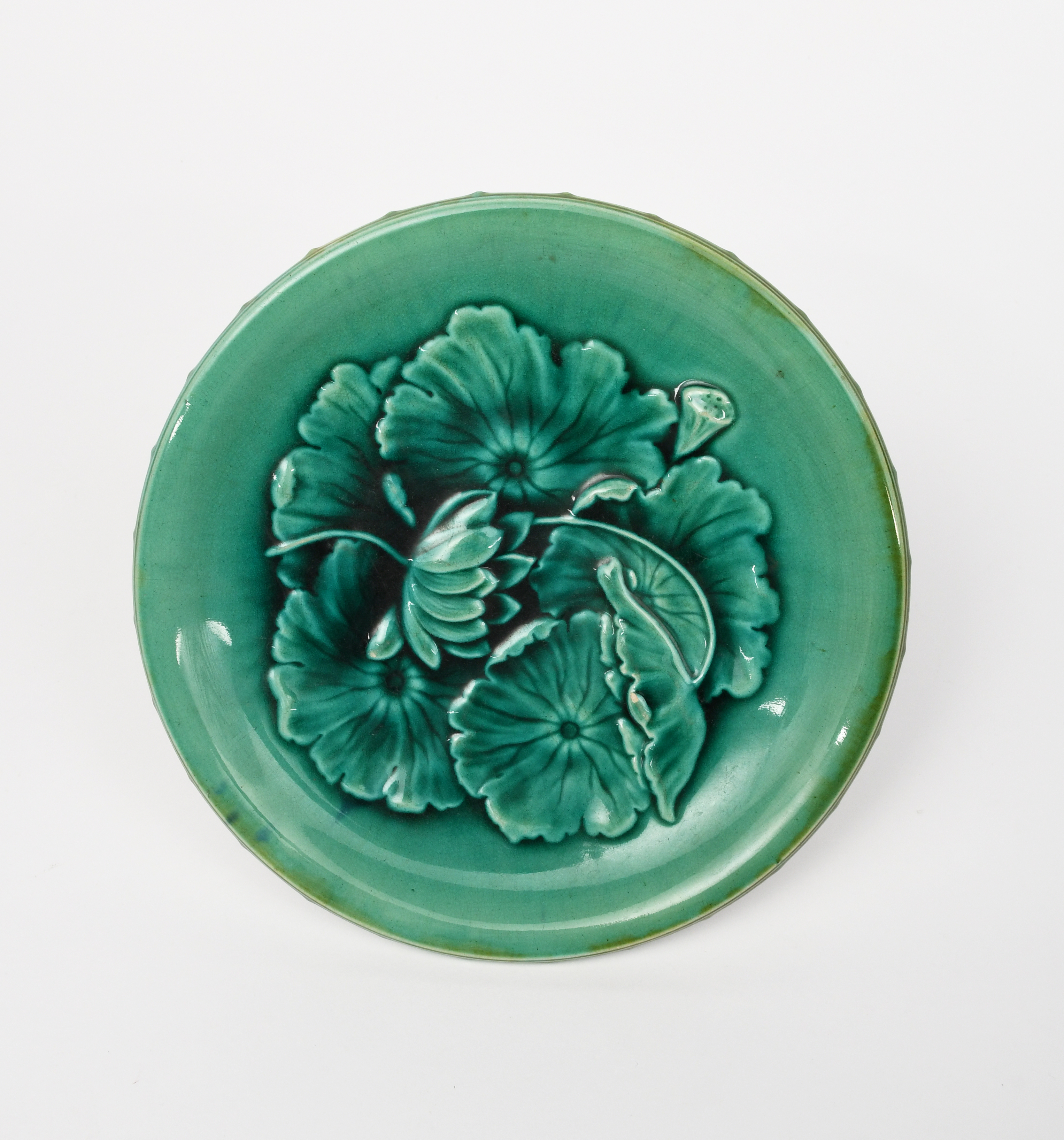 A Linthorpe Pottery plate designed by Dr Christopher Dresser, model 622, moulded in low relief with