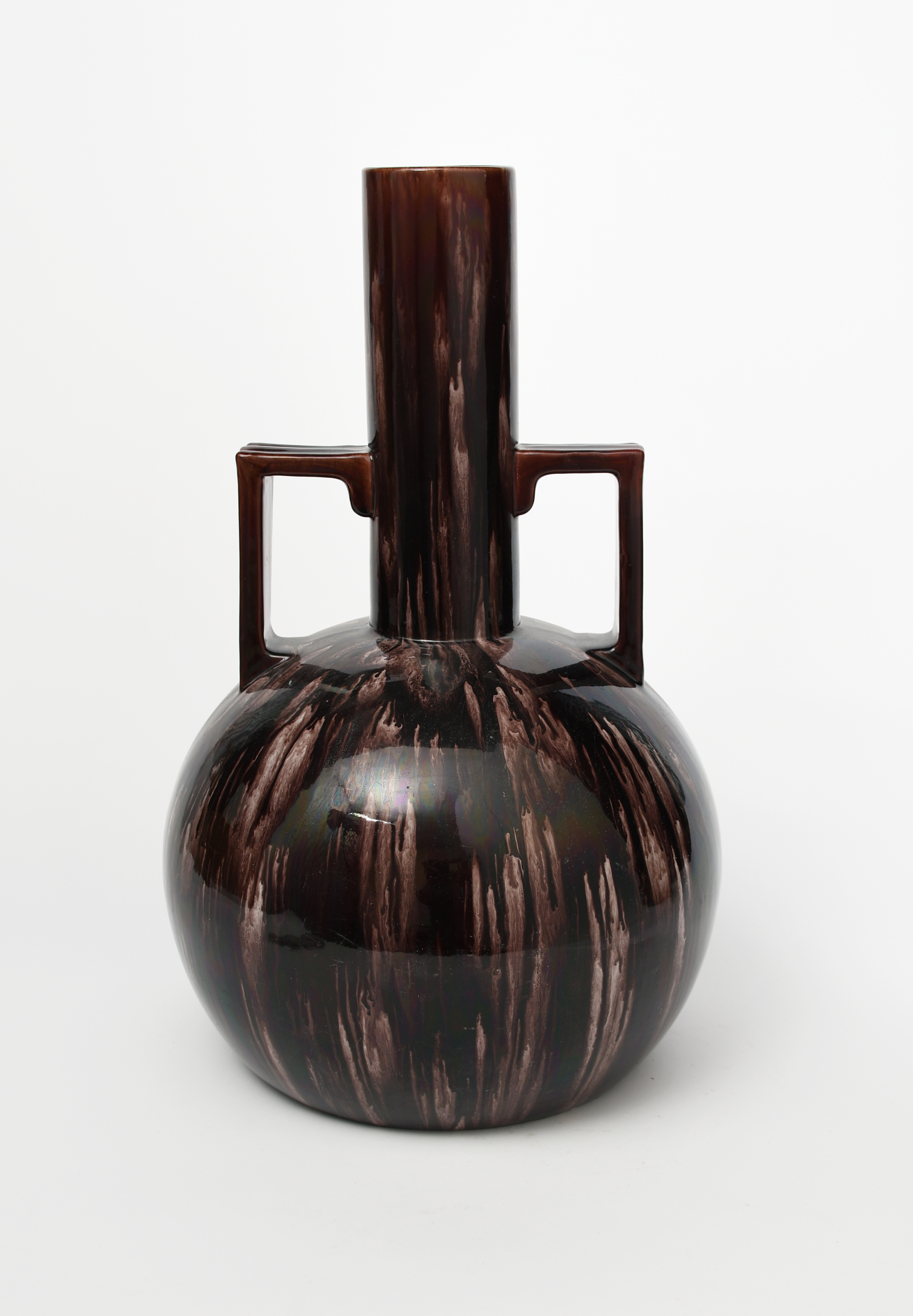 A large Ault Pottery vase designed by Dr Christopher Dresser, model no.247, ovoid with cylindrical neck and twin angular handles, covered in a streaked aubergine and white glaze, impressed marks and facsimile signature, professional restoration, 50cm. high