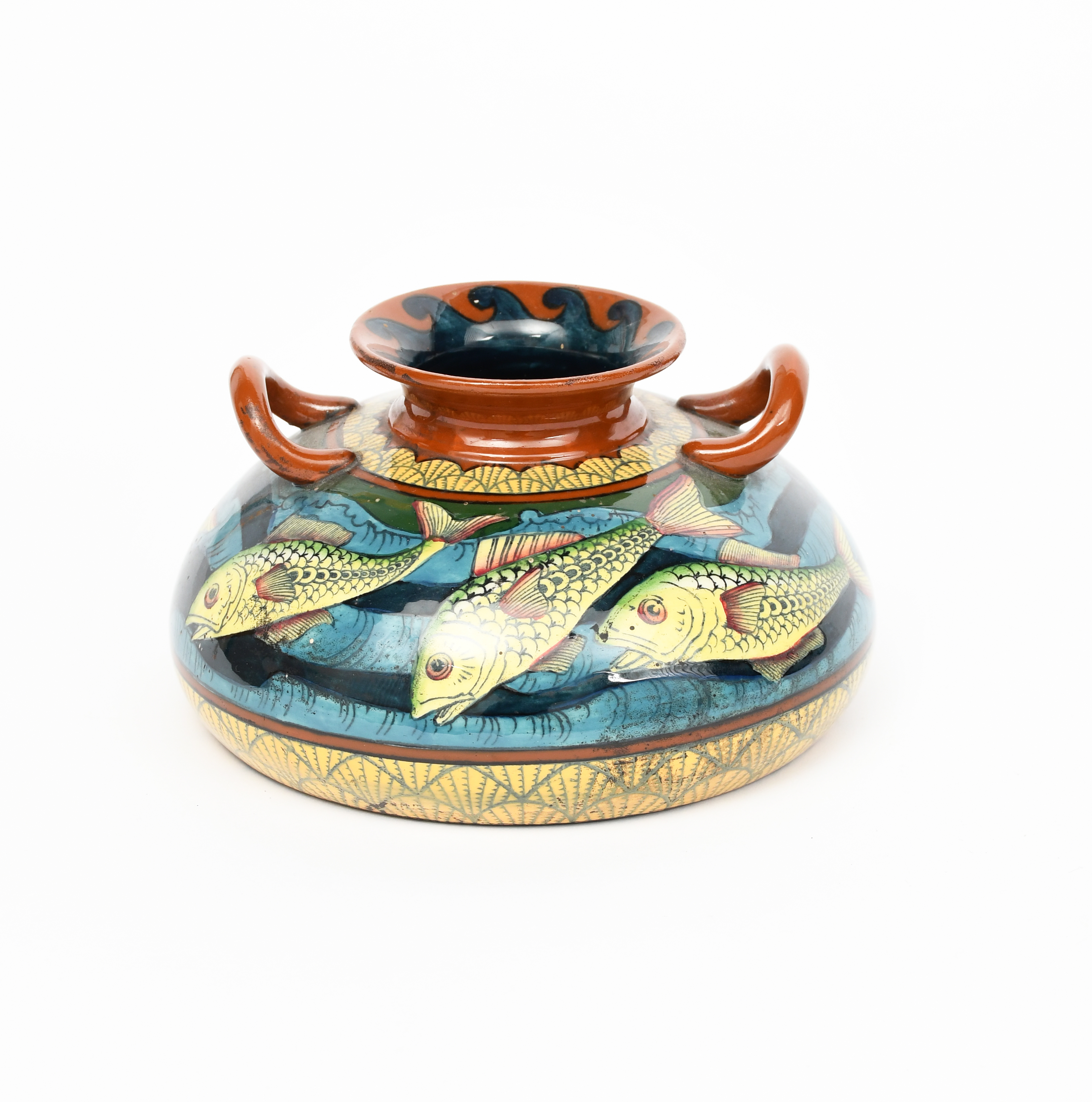 A Foley Intarsio vase, pattern 3169, compressed ovoid form with applied handles and flaring rim, printed and painted in colours with a frieze of scaly fish printed factory marks, 20cm. wide.