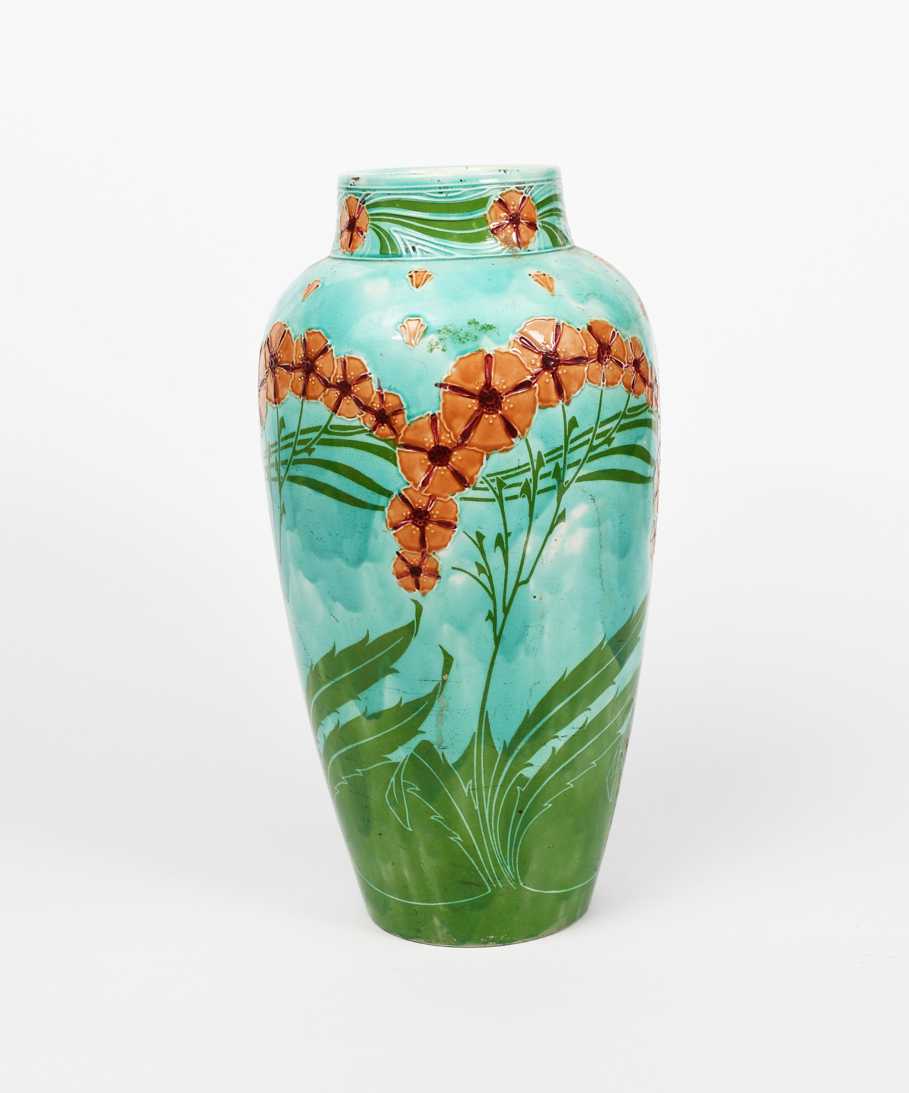 A Mintons Pottery Secessionist floor vase designed by Leon Solon and John Wadsworth, model no.3573, shouldered cylindrical form with tapering collar neck, cast in low relief, printed and painted with Art Nouveau flowers and foliage in salmon pink, red and green on a turquoise blue ground, impressed factory marks, minor glaze loss, 48cm. high