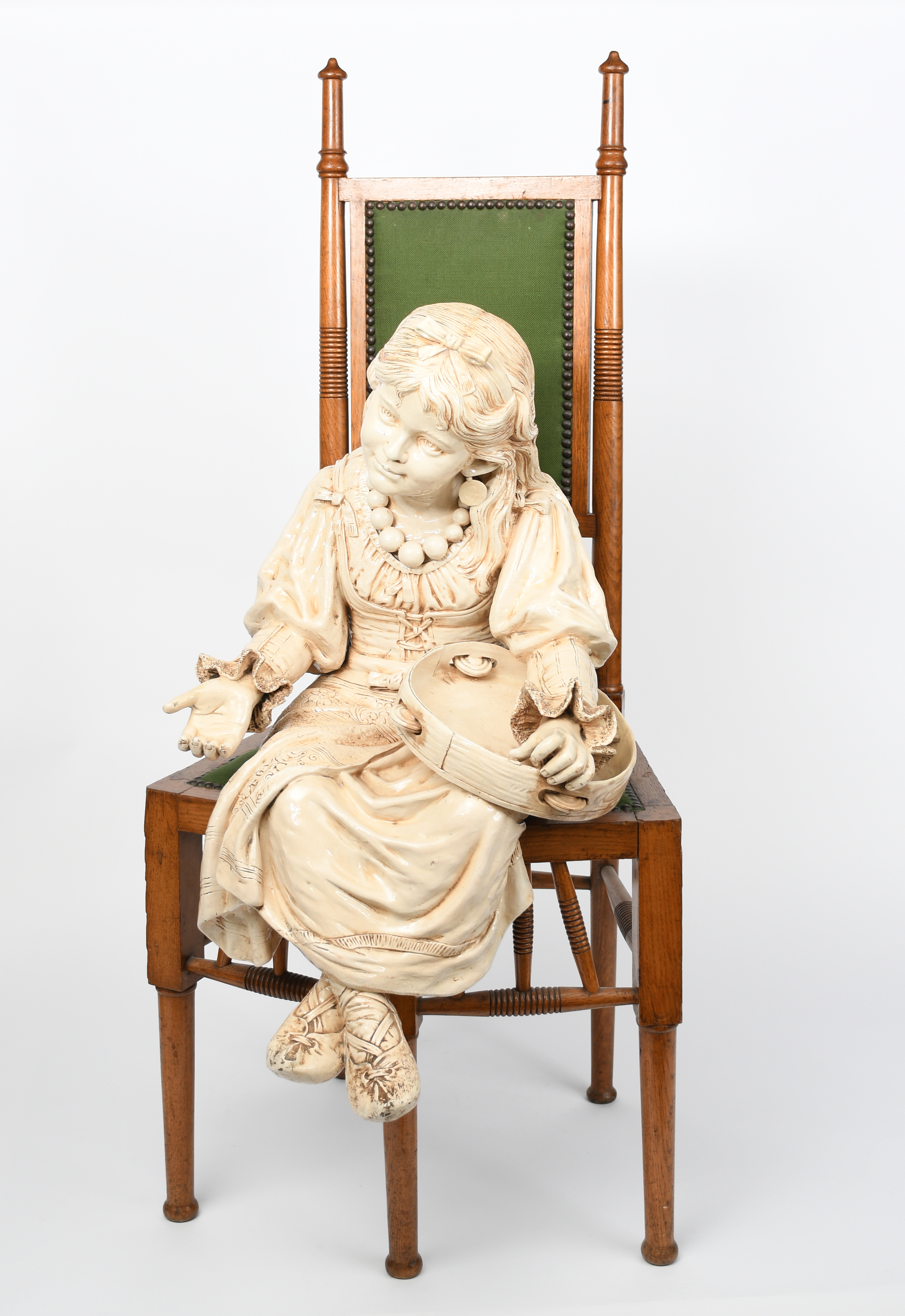 A Bretby Pottery life-sized model of a young girl, modelled seated, holding a tambourine, glazed