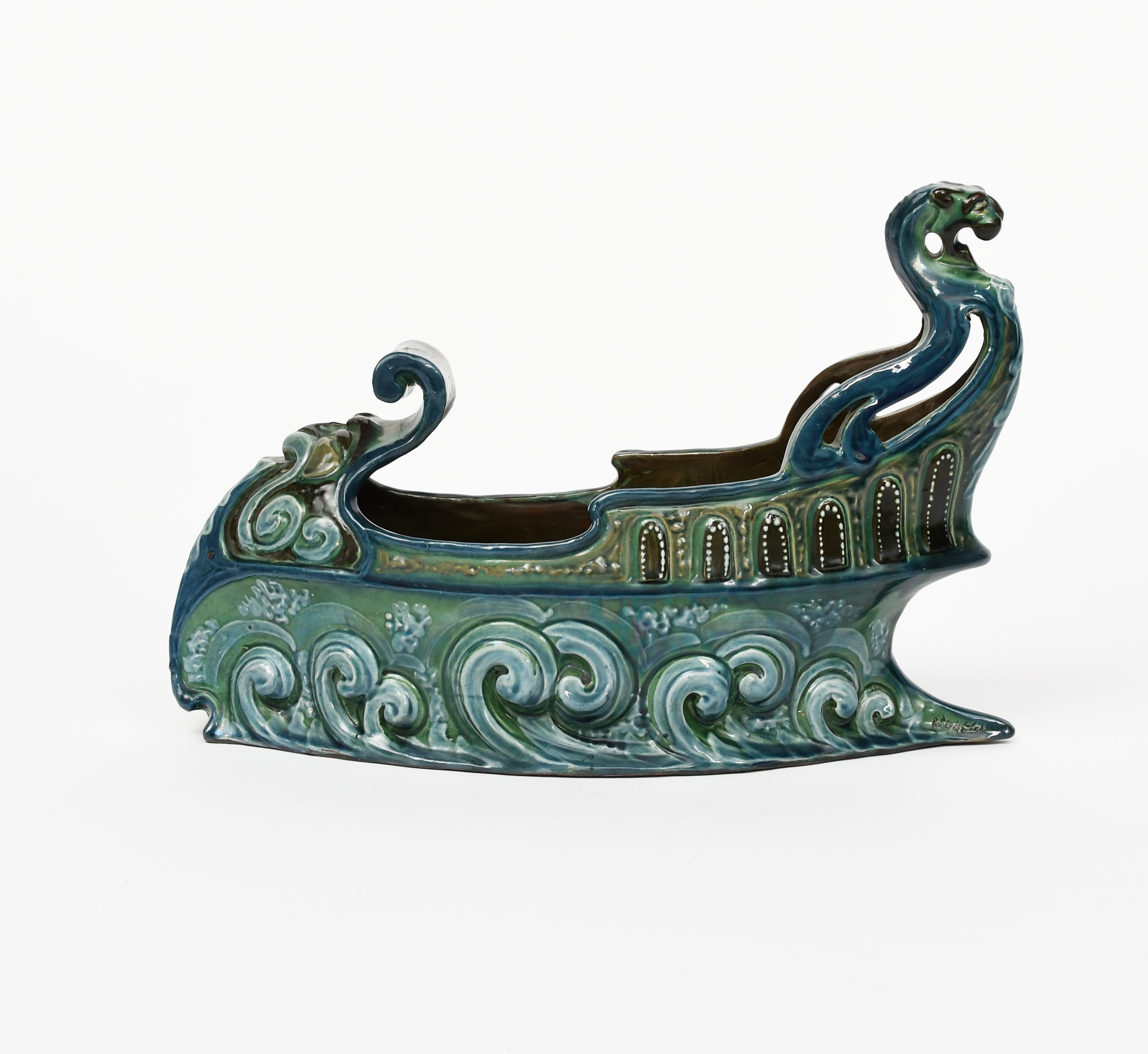 A C H Brannam Barum Ware pottery Galleon centrepiece, dated 1900, pierced and modelled design, glazed in shades of green, brown and blue, incised C H Brannam, Barum 1900, professional restoration, 29.5cm. wide.