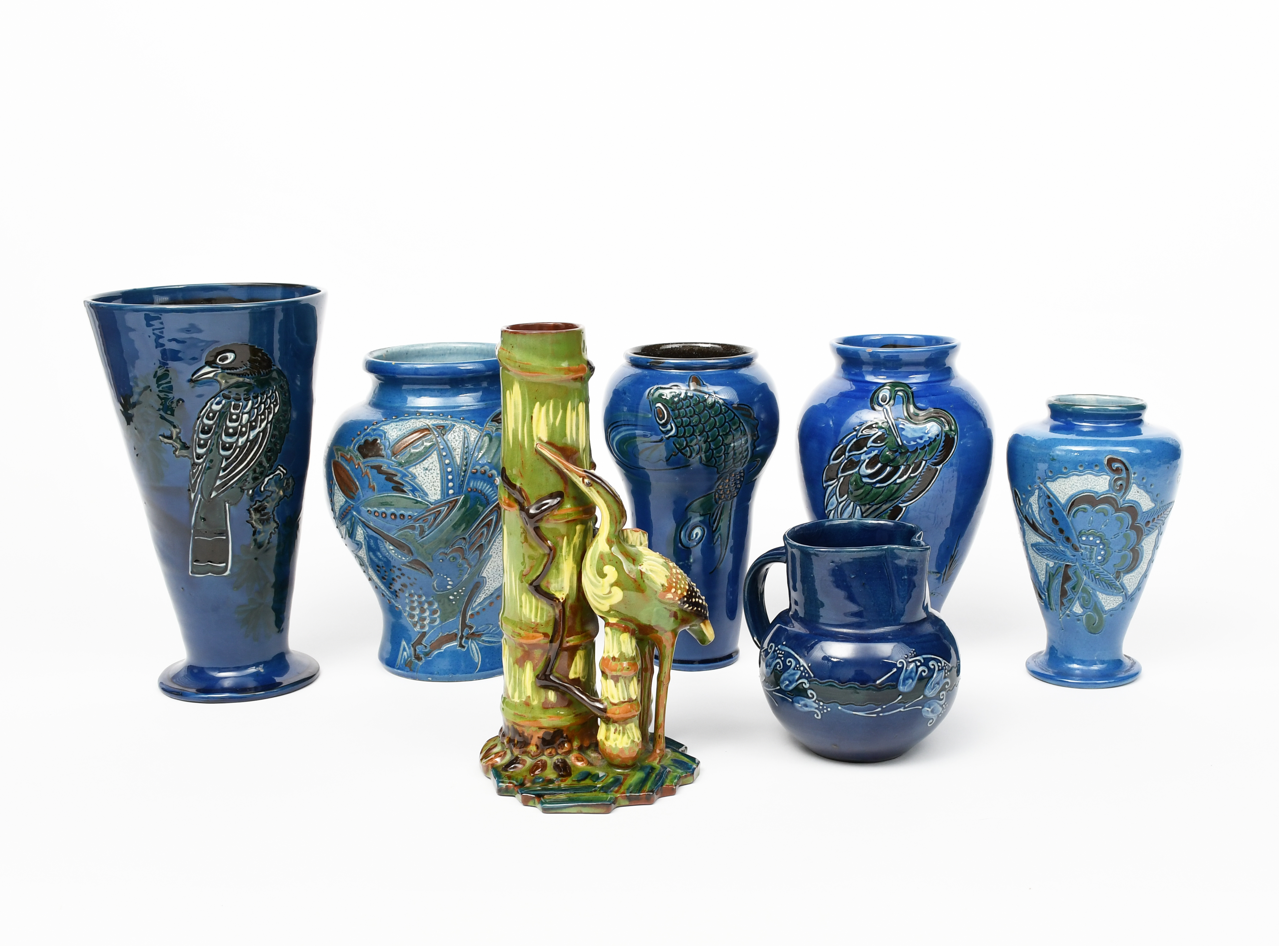 A C H Brannam Barum Ware pottery vase by Frank Thomas, modelled as a heron standing beside a tall bamboo stem painted in cream, brown and blue on a green ground, a C H Brannam vase slip decorated with a bird in colours on a blue ground, another similar, a vase decorated with a scaly fish, a vase decorated with a heron, another vase and a jug decorated with flowers incised marks FT monogram, minor chips, 24.5cm. high (7)