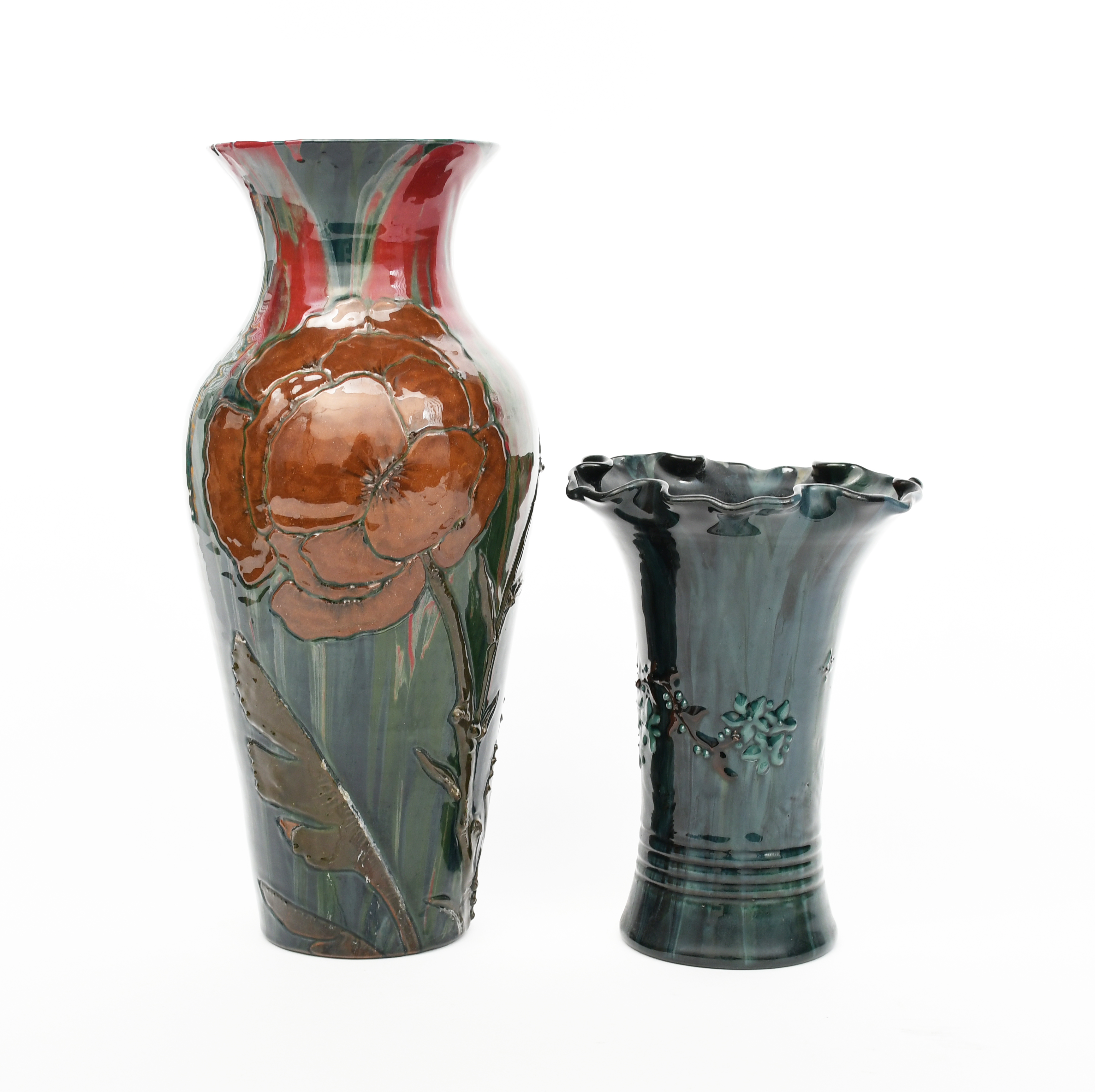 A Sunflower Pottery vase by Sir Edmund Elton, cylindrical form with flaring fluted rim, applied with a band of scrolling foliage in blue and brown on a streaked blue and green ground, and a taller vase probably Sunflower Pottery incised with large peony flowers in brown and green on a streaked red, blue and green ground, main vase painted Elton signature, second vase painted star motif, second vase chips, 24cm. high (main vase), (2)