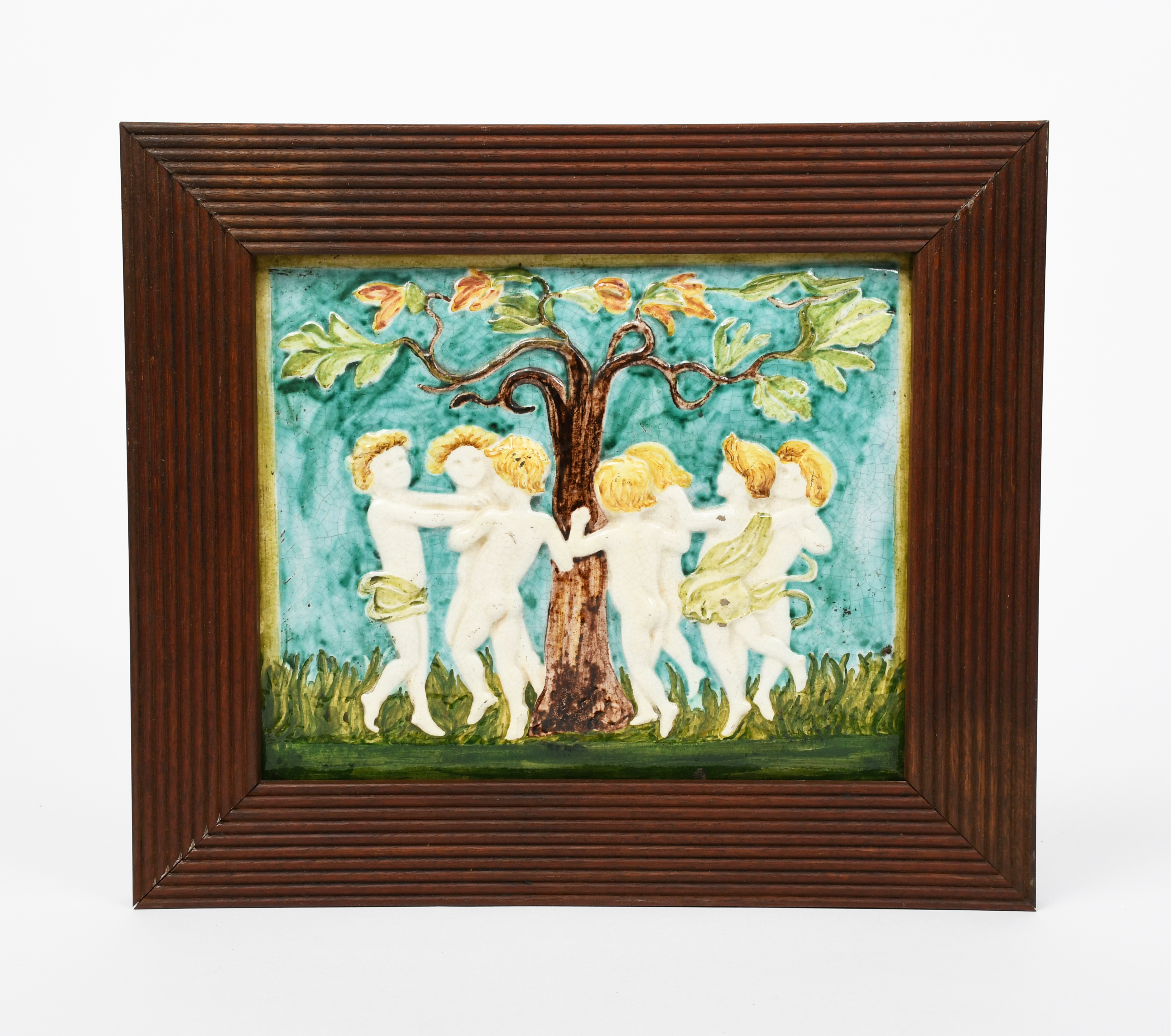 A Della Robbia plaque designed by Ellen Mary Rope, decorated by John Fogo, rectangular form, cast in low relief with children dancing around a tree, in shades of blue, green, brown and yellow, framed, incised marks, JF monogram, 21.5 x 16.5cm.