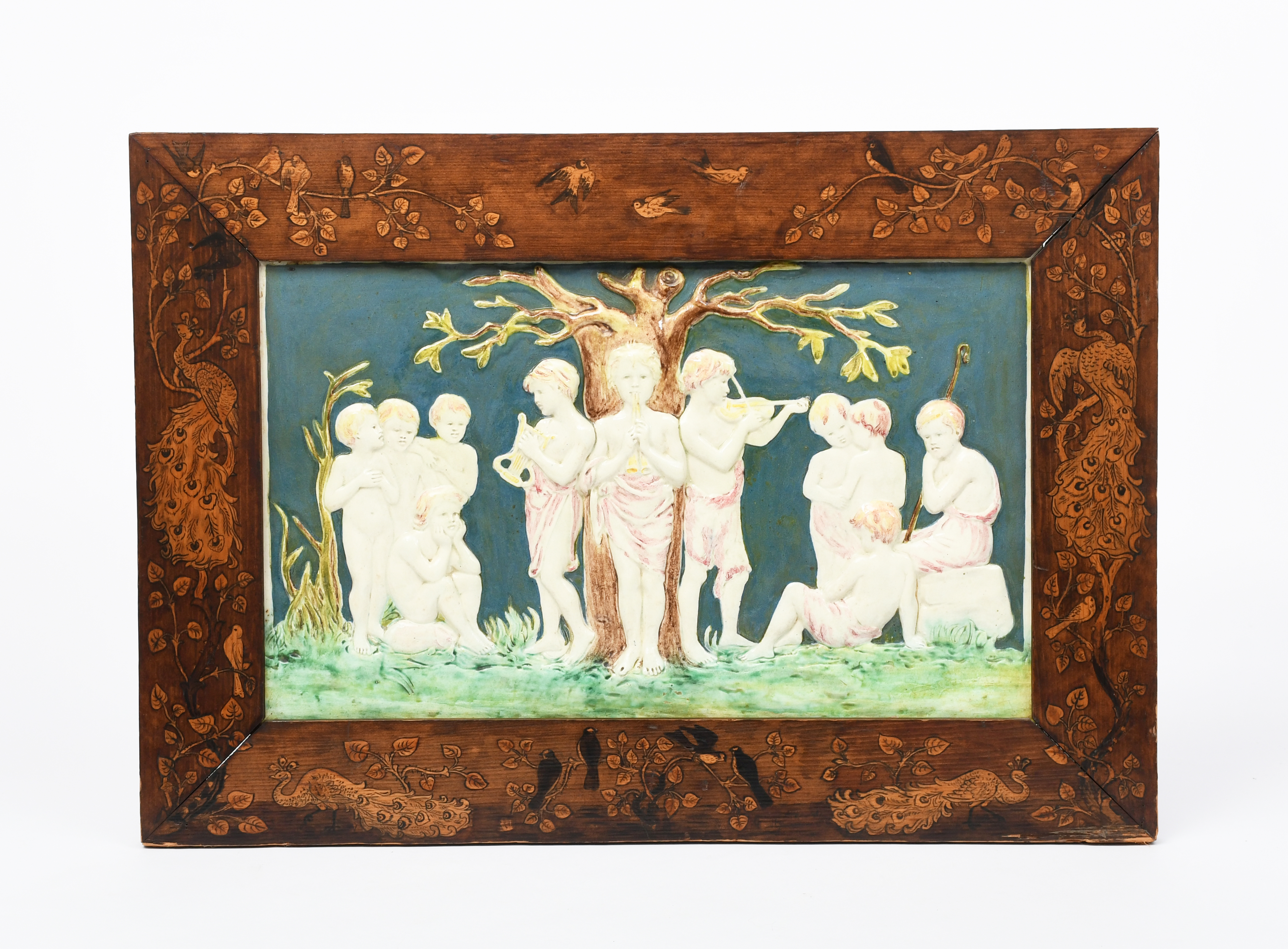 Melody a large Della Robbia Pottery plaque designed by Ellen Mary Rope, rectangular cast in low relief with three young figures playing music gathered around a central tree, as two groups of young figures listen and rest, in colours, in pokerwork wooden frame, incised numbers to reverse, 48 x 29cm.