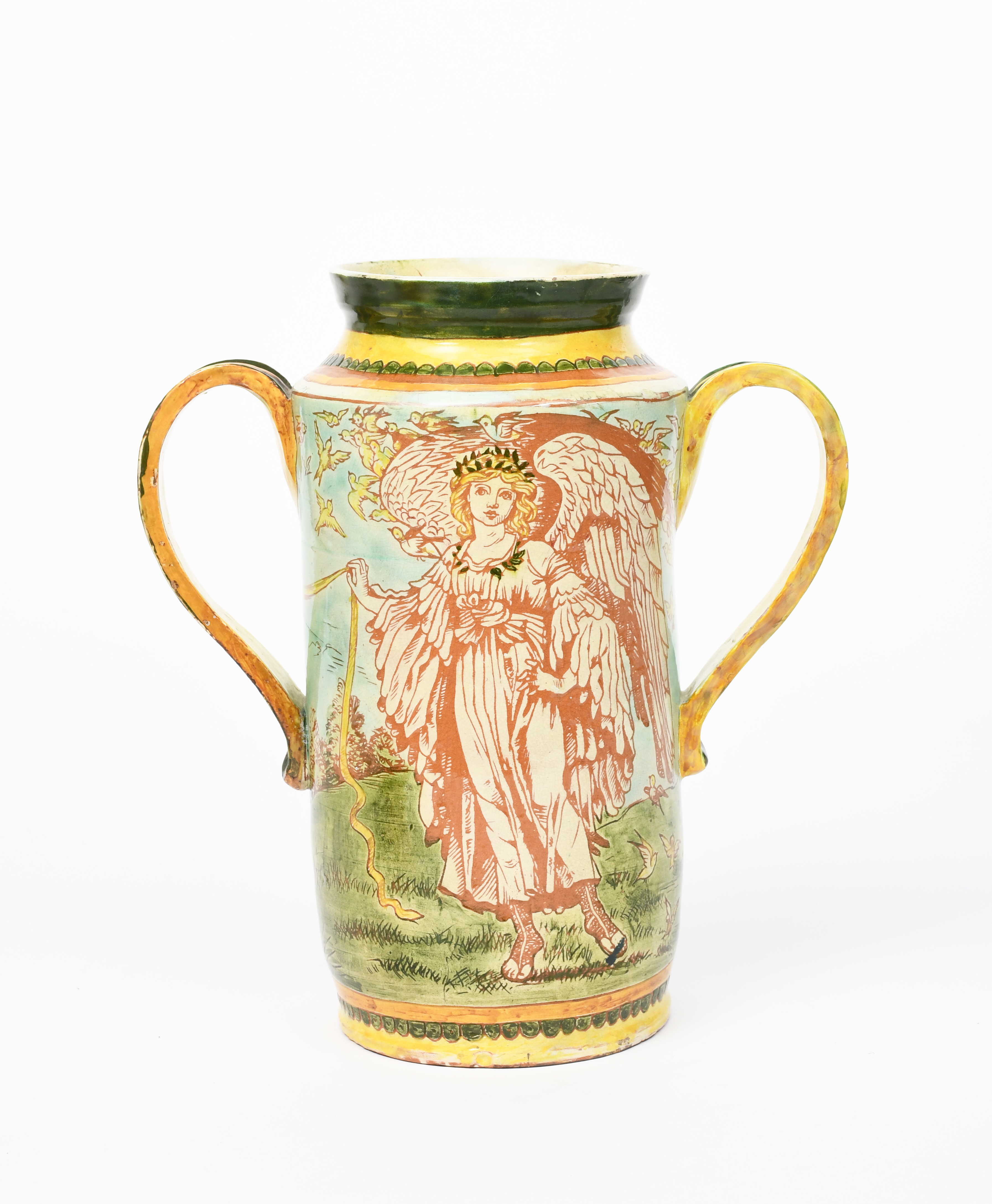 A Della Robbia twin-handled Albarello vase by Aphra Peirce, painted with a classical draped figure, holding a large arrow in her hand, in her other hand a flowing scarf blowing in the wind, held by an angel to the reverse, in colours, incised marks, professional restoration, 35.5cm. high