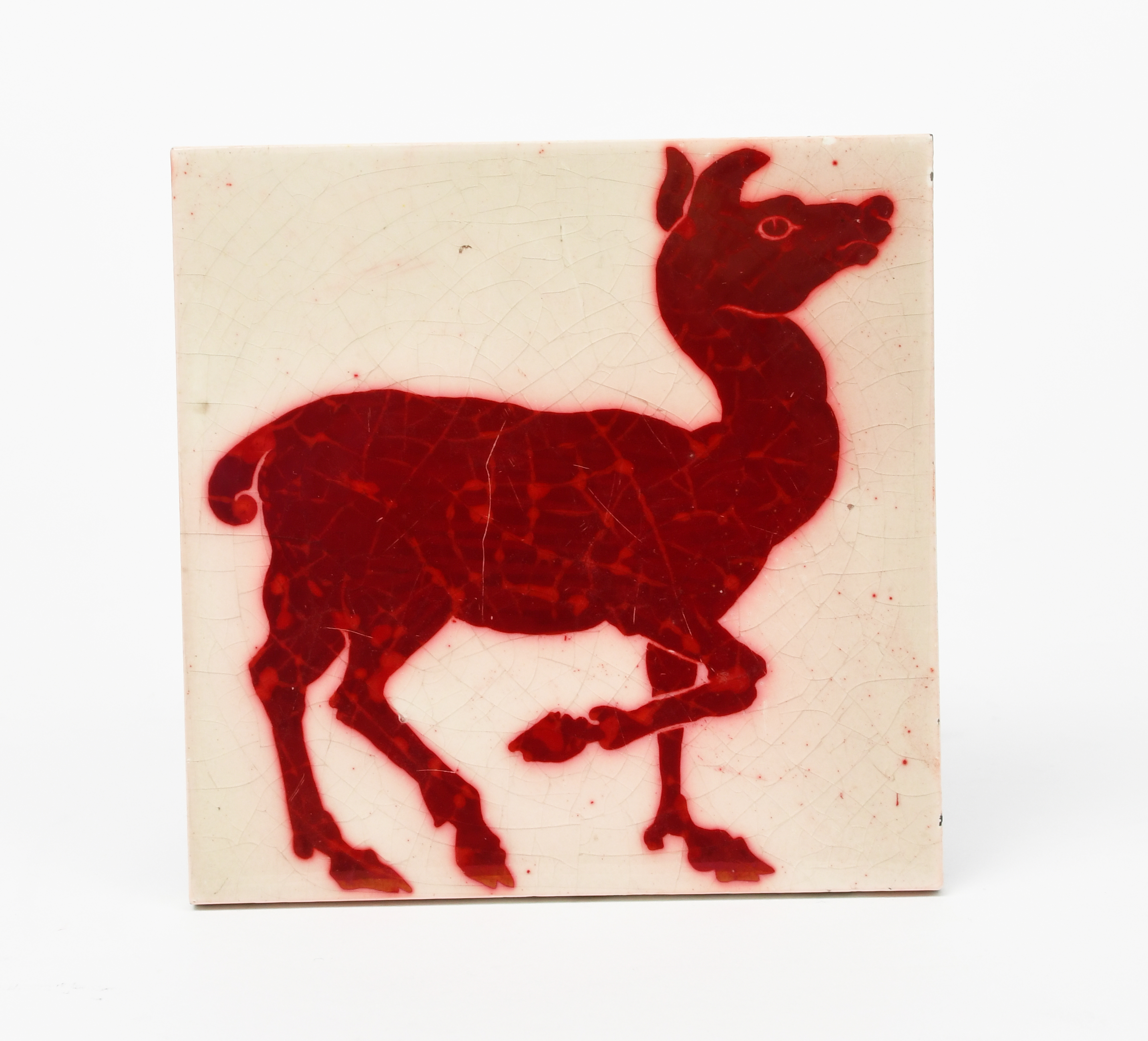 A William De Morgan ruby lustre Doe tile, painted with a young deer in ruby lustre on a white ground, Sherwin Patent tile, 15.2cm. square.