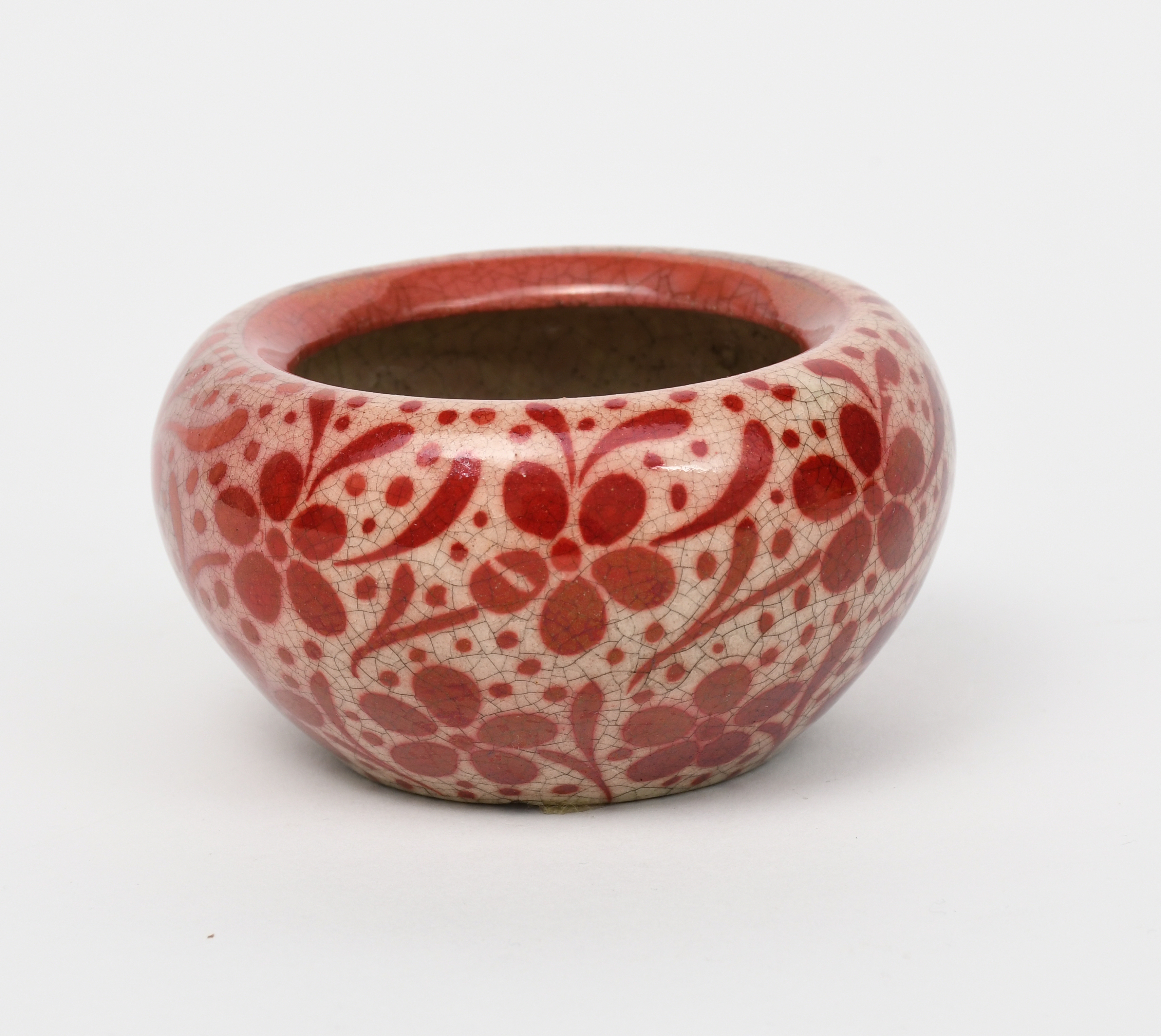 A small William De Morgan bowl, with inverted rim, painted with simple flowers and foliage on a dotted ground, in ruby on a white ground impressed De Morgan mark, 11cm. diam.