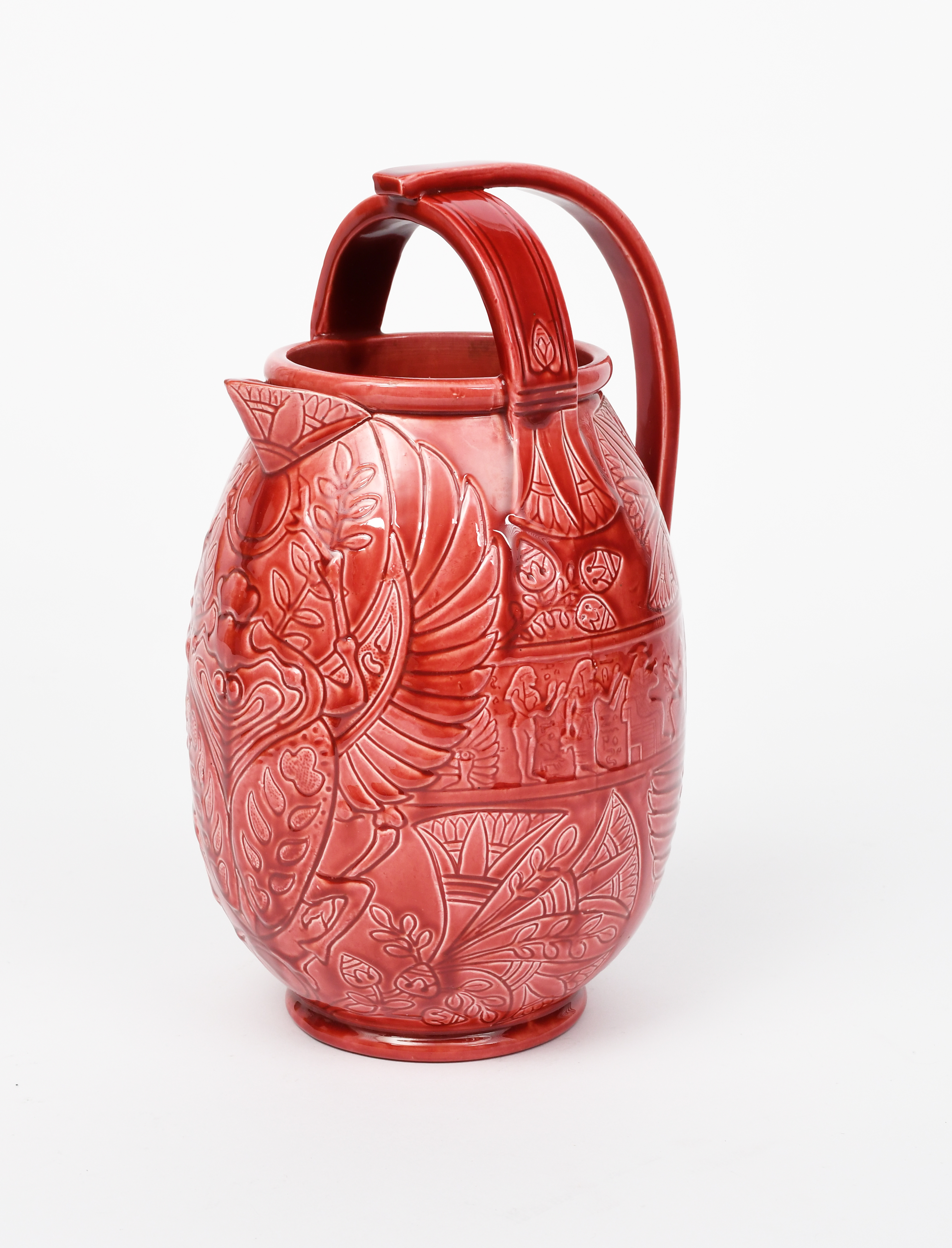 A Burmantoft's Faience pottery ewer, model no. 1737, swollen form with over-slung handle, cast in low relief with Egyptian motif, glazed red, impressed marks, professional restoration to handle, 31.5cm. high