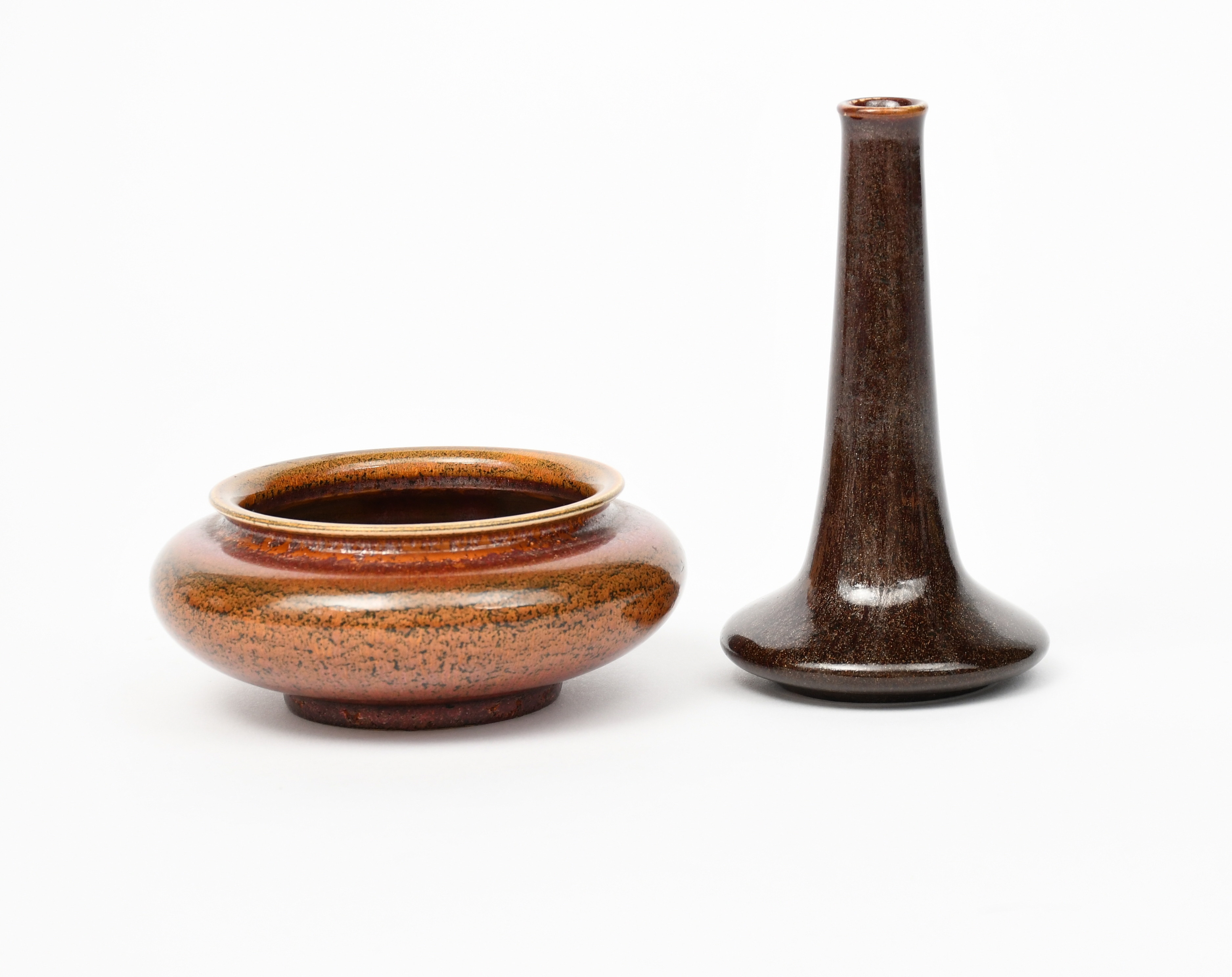 An Ashby Guild solifleur vase, compressed body with tapering cylindrical neck, covered in an aventurine glaze, and a Pilkington's Lancastrian bowl covered in an aventurine glaze impressed marks, 12.5cm. high (2)
