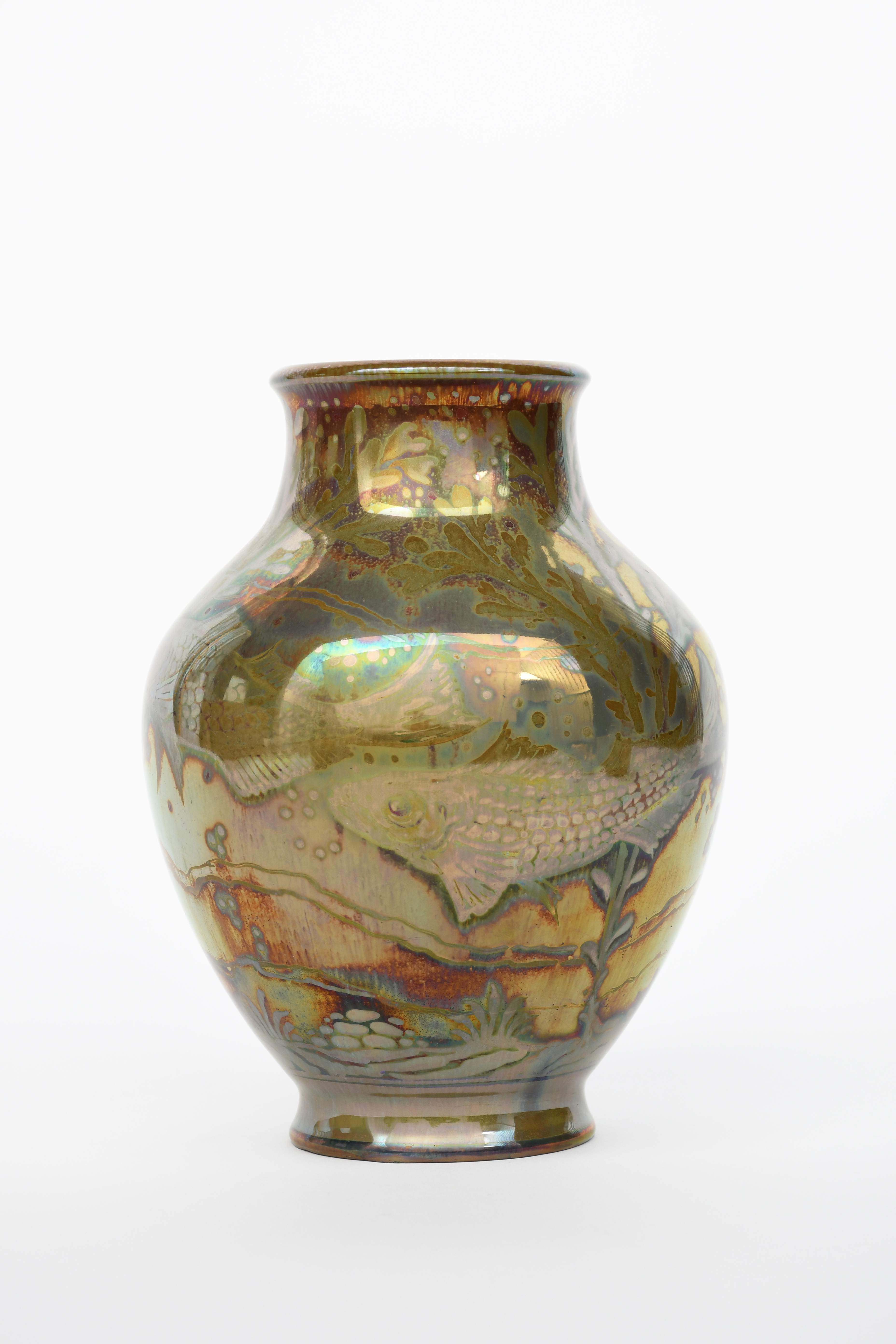 A Pilkington's Royal Lancastrian Pottery vase by Richard Joyce, shouldered form, painted with large scaly fish amongst waterweed, in golden lustre impressed factory mark, painted monogram, 23cm. high