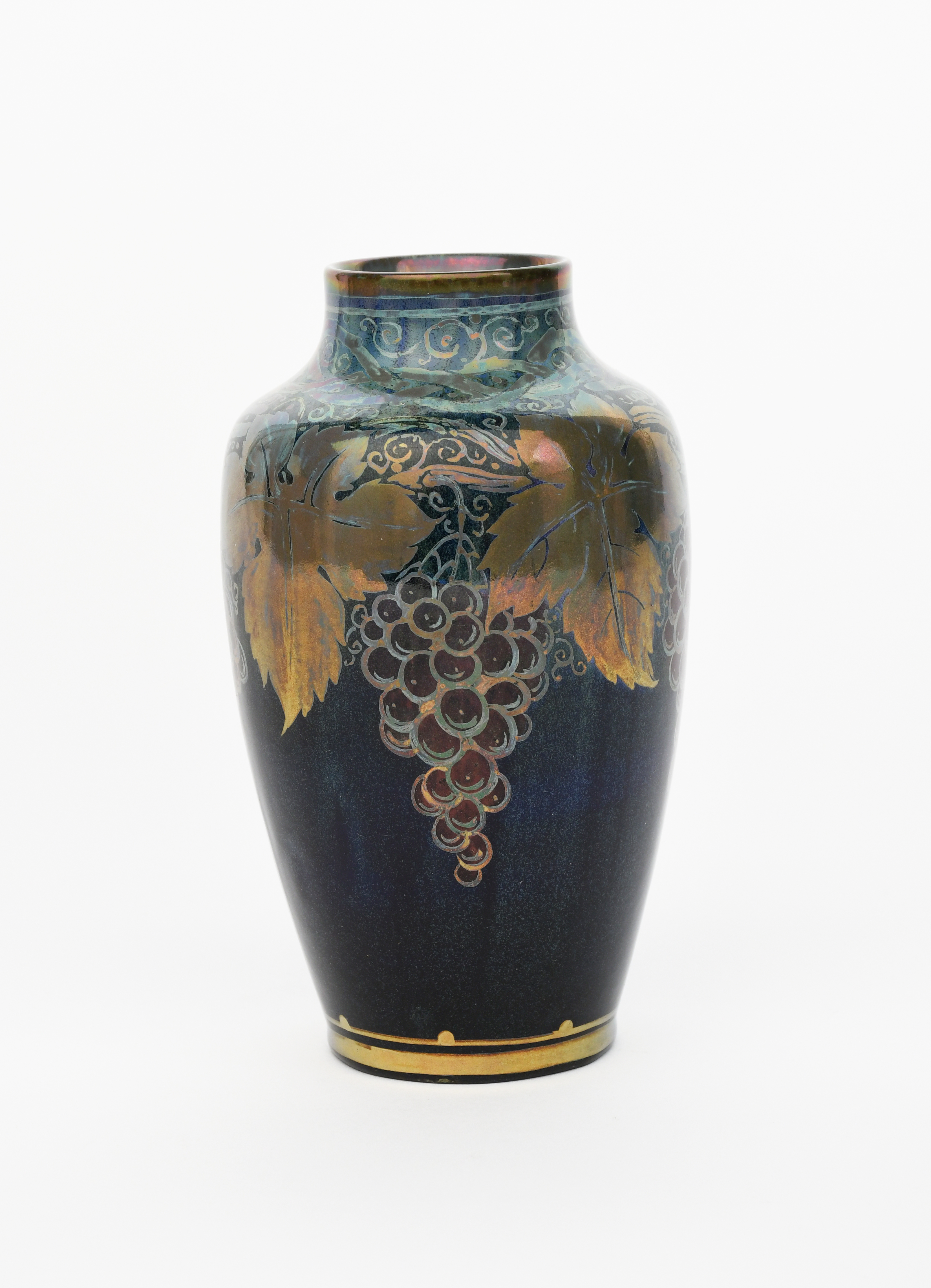 A Pilkington's Lancastrian Pottery vase by Richard Joyce, shouldered form, painted with a frieze of fruiting grape vine, in ruby and gold lustre on a blue ground, painted monogram, 17cm. high