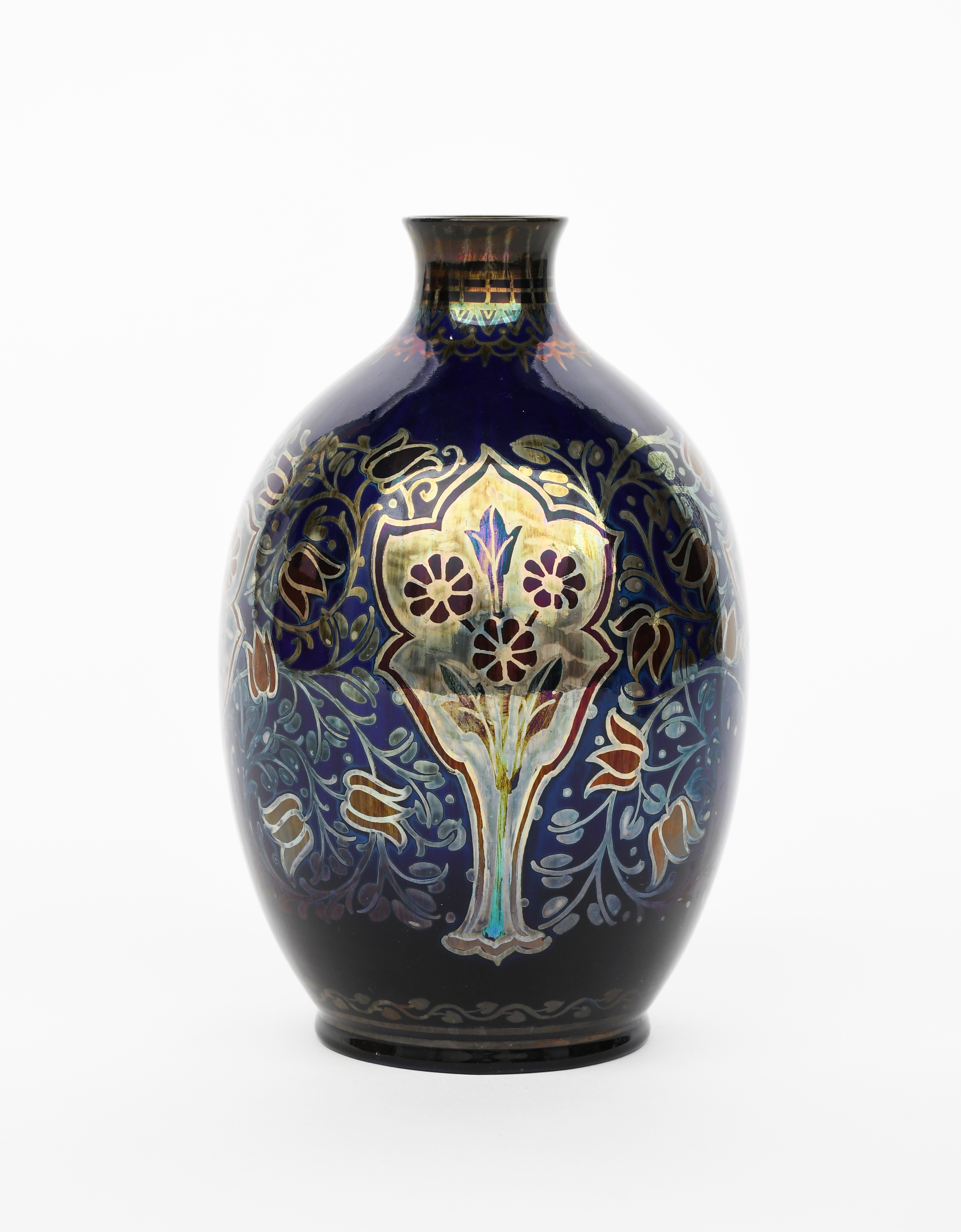A Pilkington's Lancastrian Pottery vase by William S Mycock, dated 1922, shouldered form, painted with foliate panels, inside scrolling foliage in gold and ruby lustre on a blue lustre ground, impressed and painted marks, painted date and monogram, 22.5cm. high