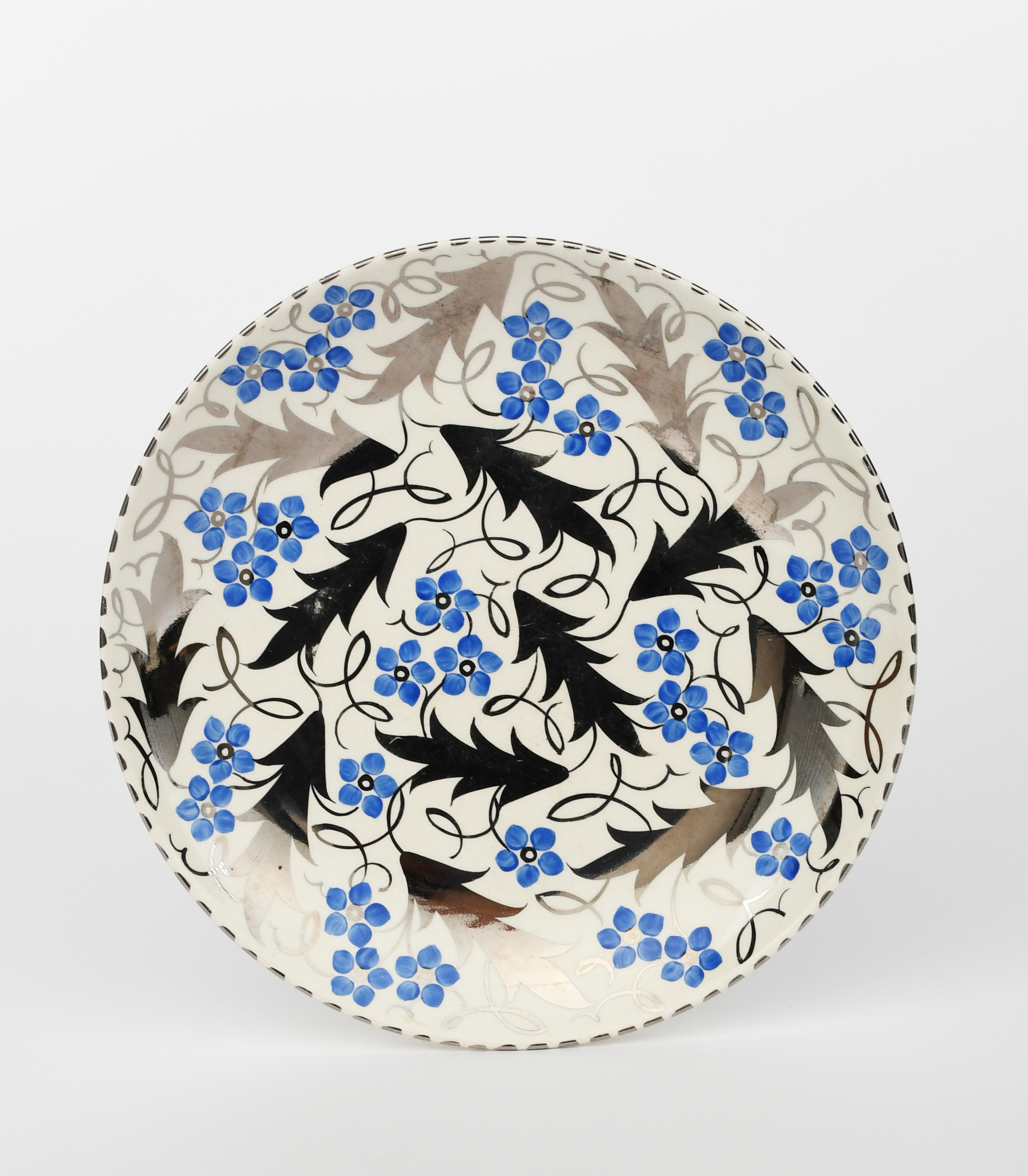 A Wedgwood plate by Powell, painted with stylised blue flowers and large silver leaves, on white ground, impressed marks, painted AMM7667, 24cm. diam.