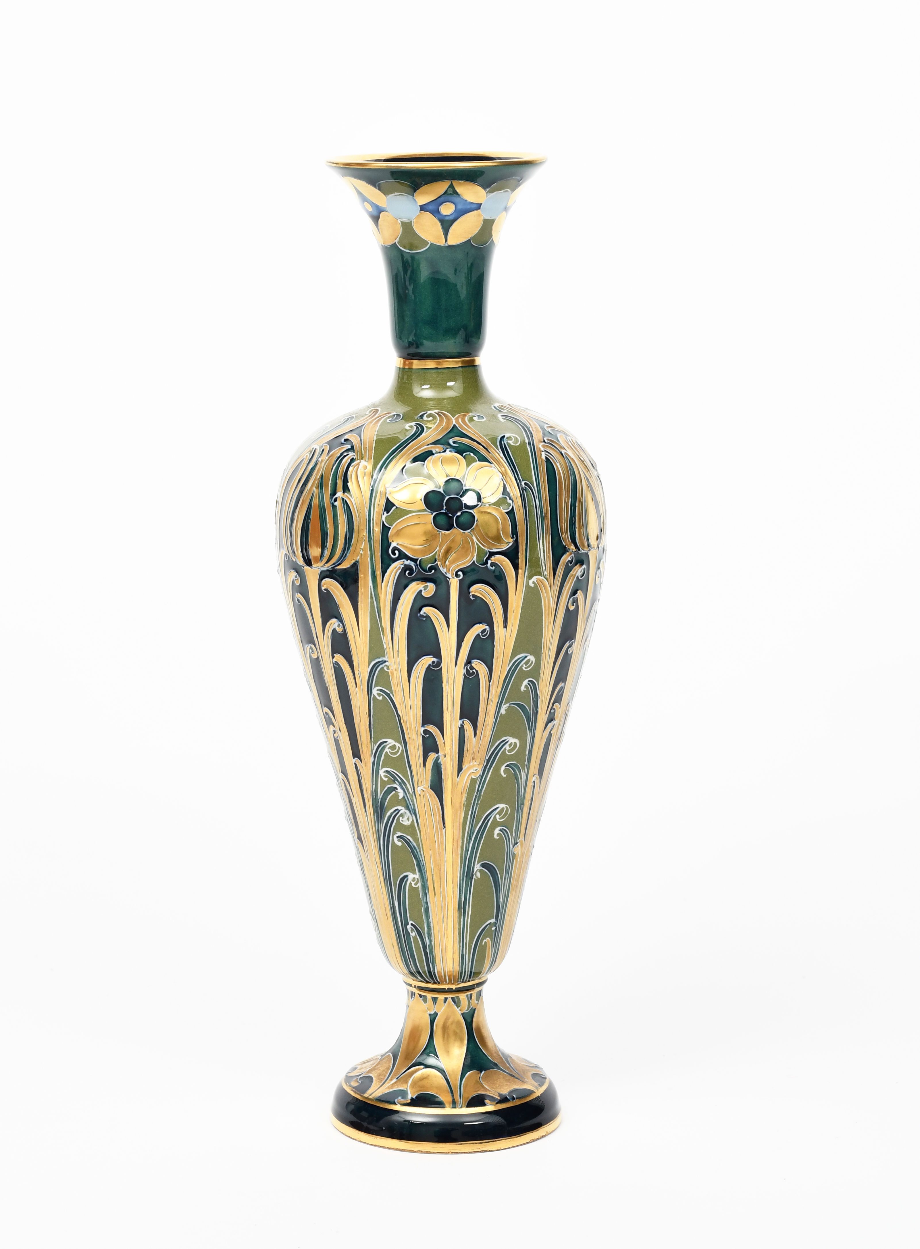 A James Macintyre Green and Gold Florian Ware vase designed by William Moorcroft, slender baluster vase, tubeline decorated with floral cartouche in green, blue and gold, printed factory mark, painted green signature, 30.5cm. high