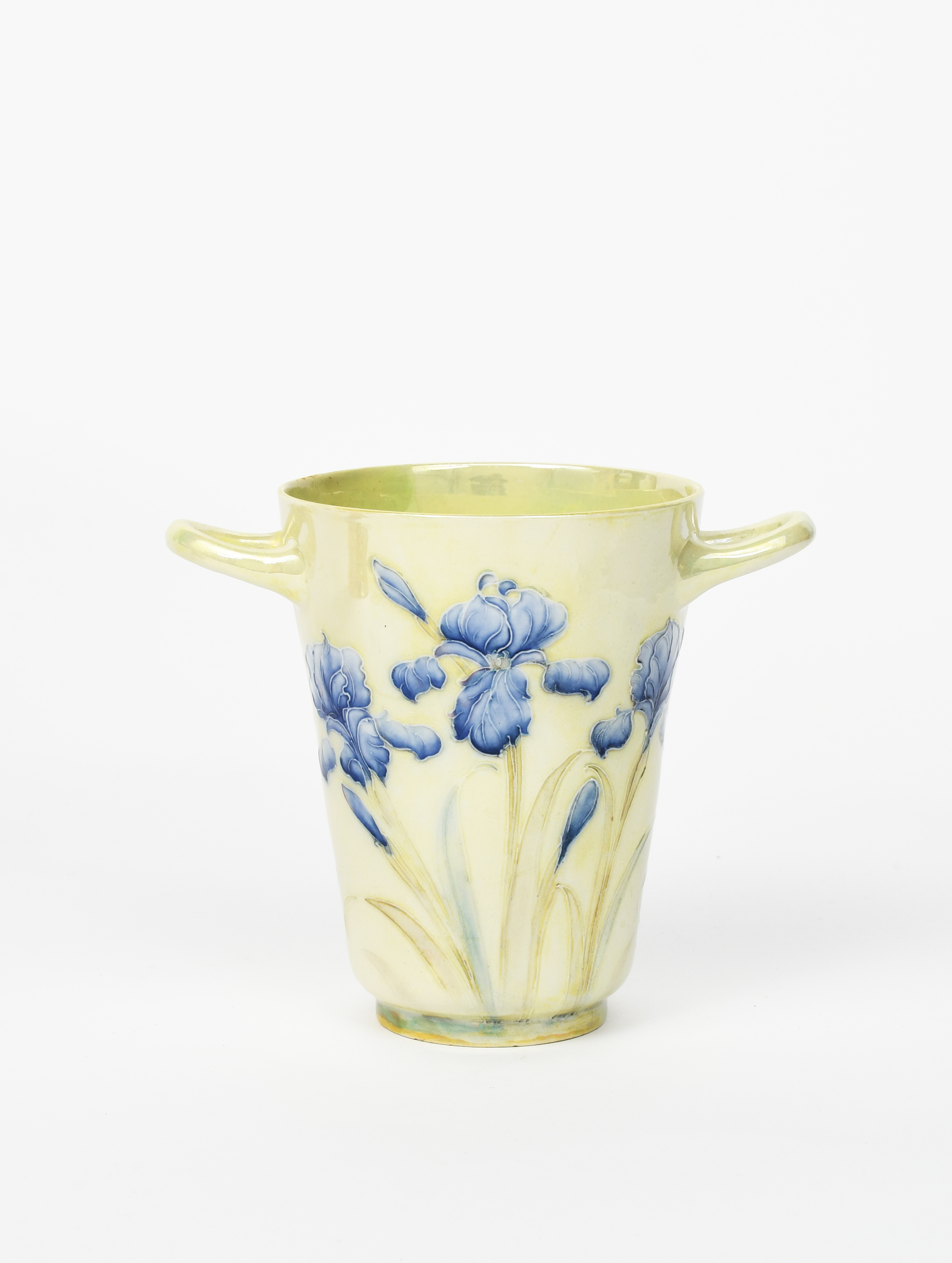 Iris a rare twin-handled lustre vase designed by William Moorcroft for retail by Liberty & Co, flaring conical form, with applied handles, tubeline decorated glazed green and blue on a yellow lustre ground, painted green signature, printed Liberty mark, restored, 15cm. high