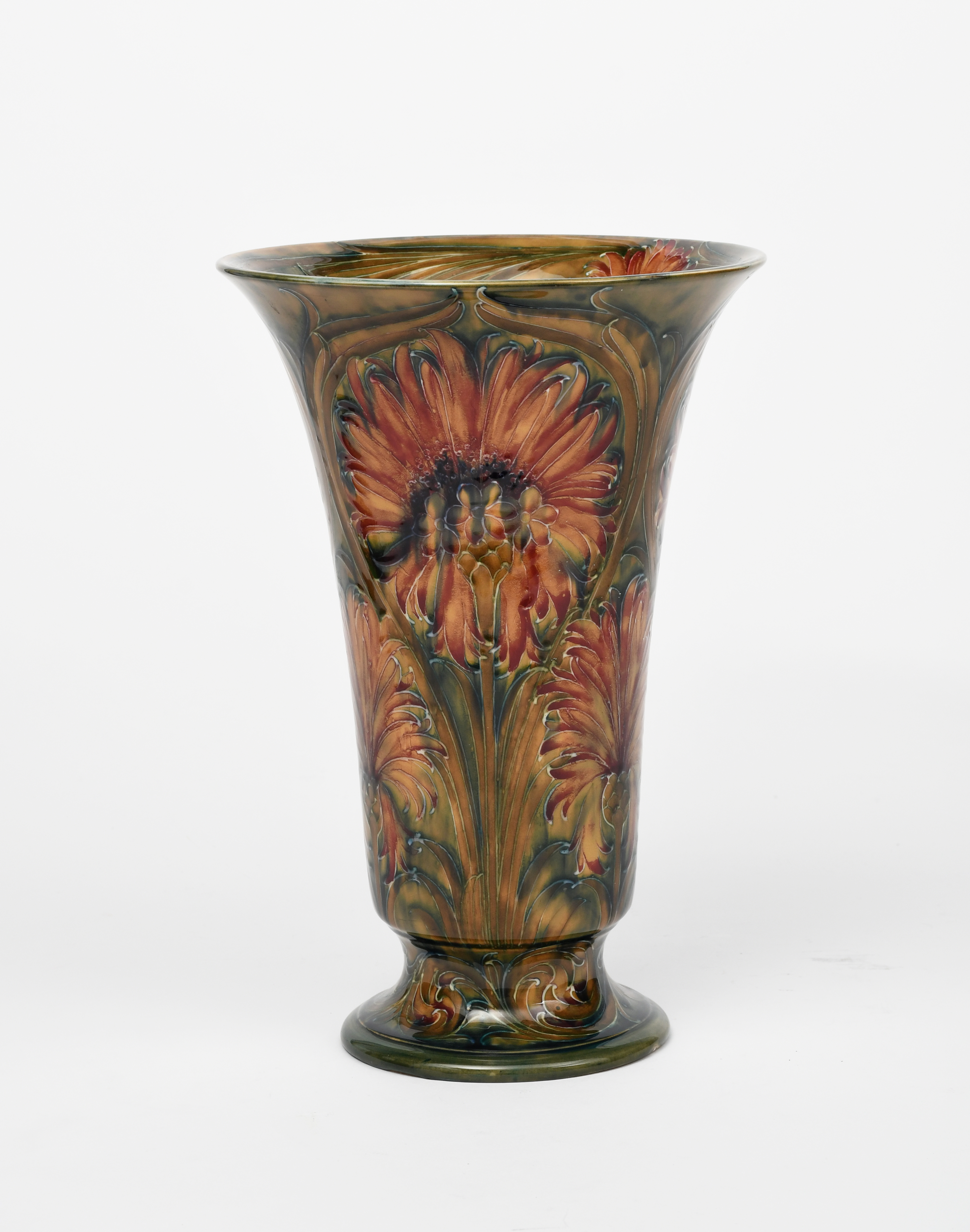 Chrysanthemum/Revived Cornflower a tall James Macintyre footed vase designed by William Moorcroft,