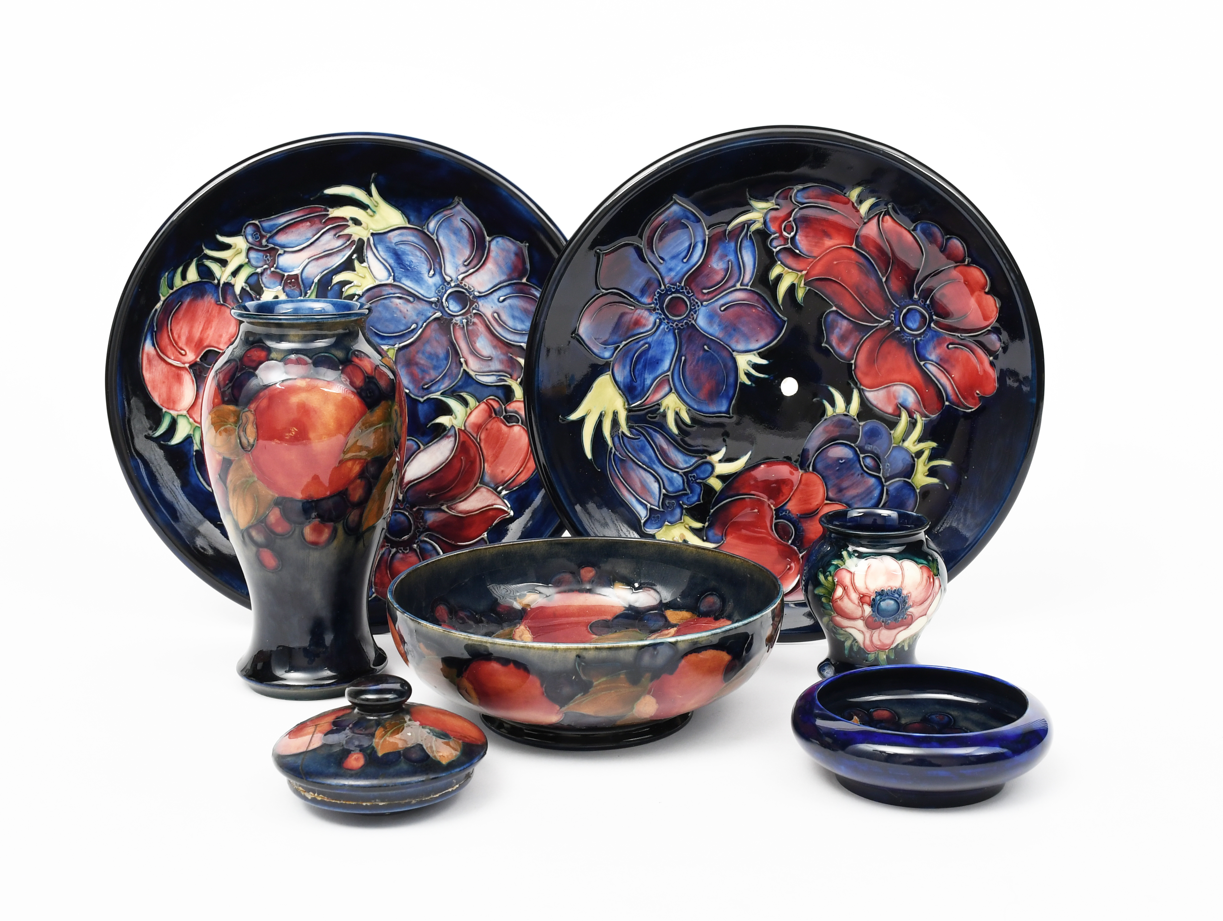 Pomegranate a Moorcroft Pottery baluster vase designed by William Moorcroft, painted in shades of pink, purple, ochre and green on a blue ground, a Moorcroft Pomegranate bowl, pin tray, three Moorcroft Anemone pieces, a Moorcroft Pottery lid and a Tudric pewter stand, impressed mark, painted green signature, 18cm. high (8)