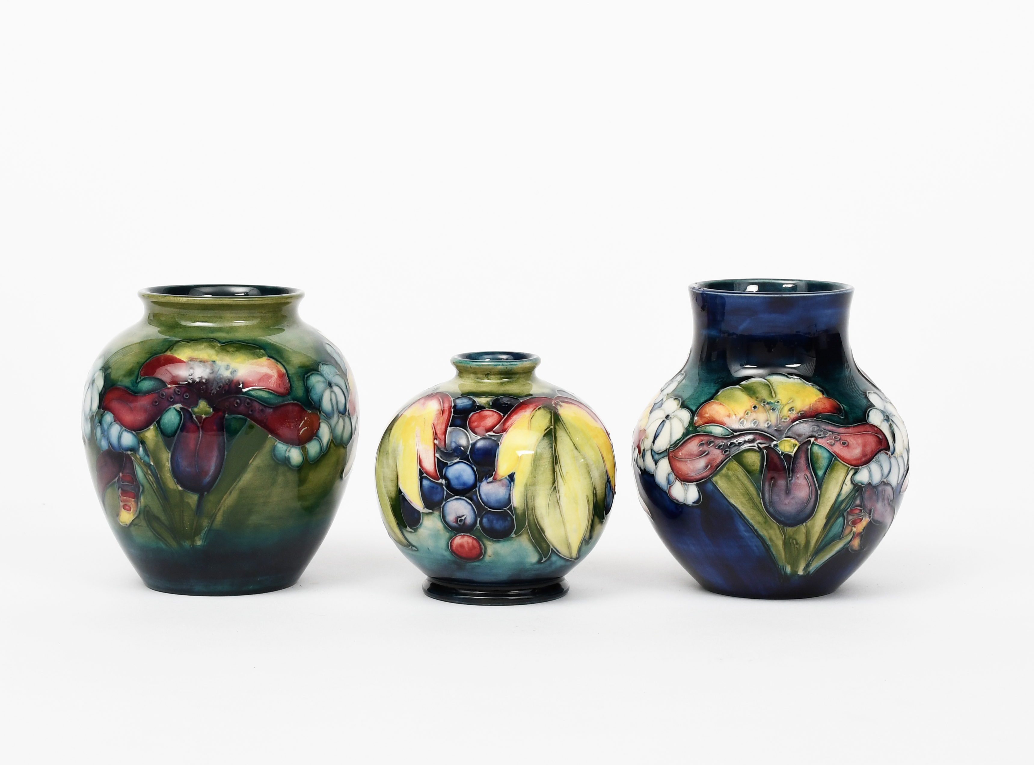 Leaf and Berry a Moorcroft Pottery vase designed by Walter Moorcroft, ovoid tubeline decorated in colours on a graduated green ground, and two Moorcroft Pottery Frilled and Slipper Orchid vases, impressed and painted marks, repaired chip to rim of one, 10cm. high (3)