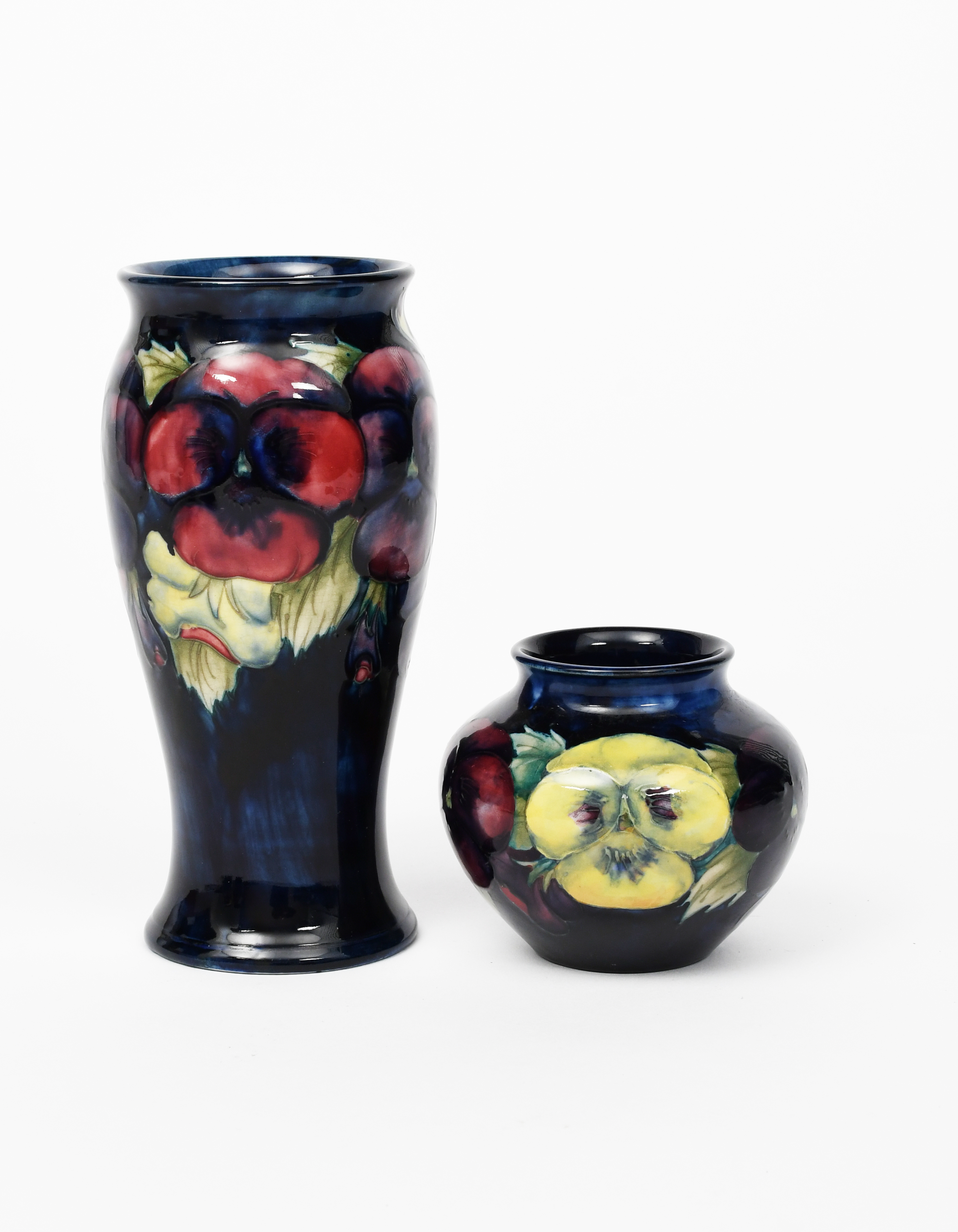 Pansy a Moorcroft Pottery vase designed by William Moorcroft, shouldered form, tubeline decorated in shades of pink, purple, yellow and green on a blue ground, and another smaller, impressed and painted marks, 20cm. high (2)