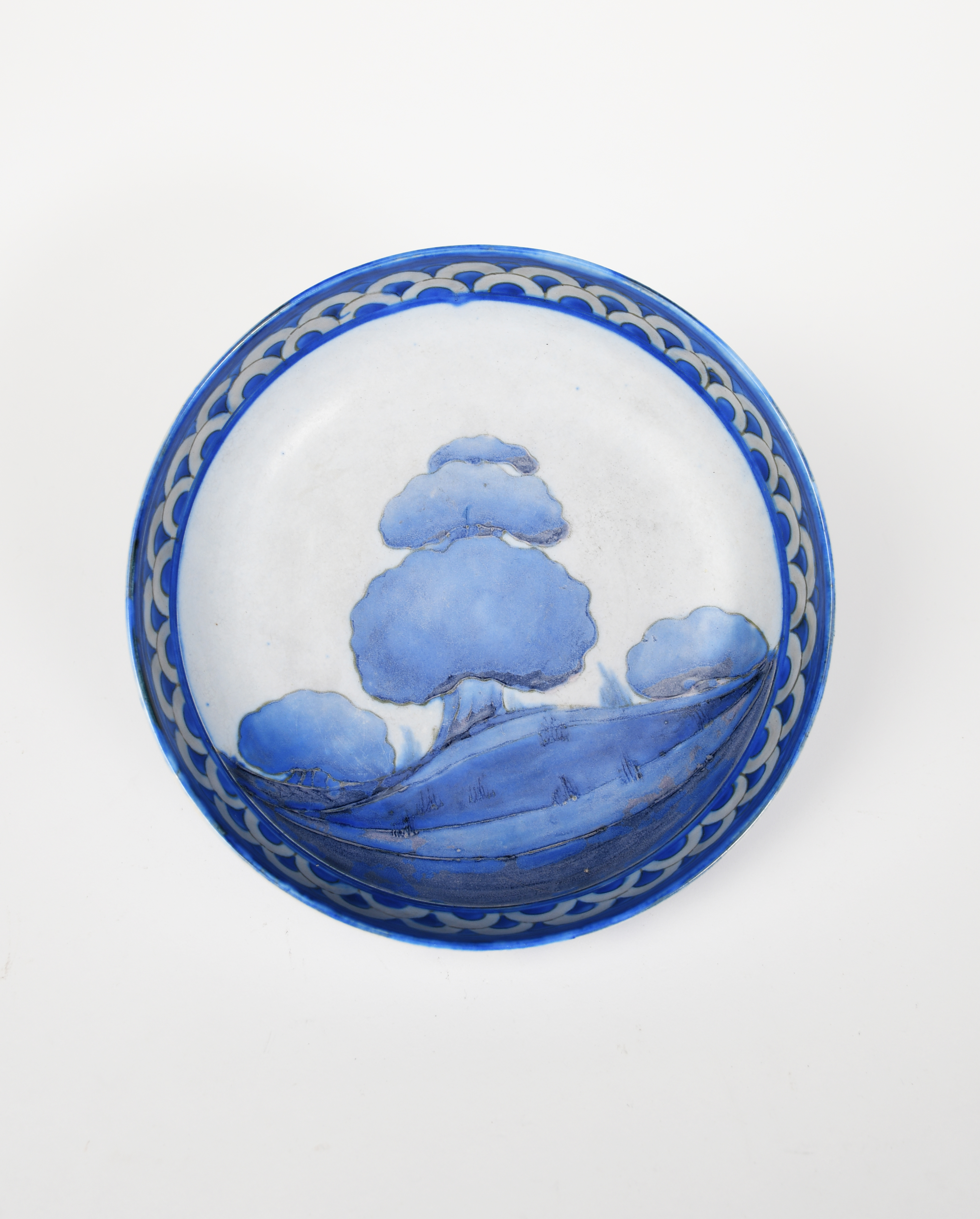 Dawn a Moorcroft Pottery bowl designed by William Moorcroft, on shallow threaded foot, tubeline decorated with trees in a landscape, inside scallop border in shades of blue, impressed marks, painted blue signature, threaded foot for pewter mount, 20.5cm. diam.