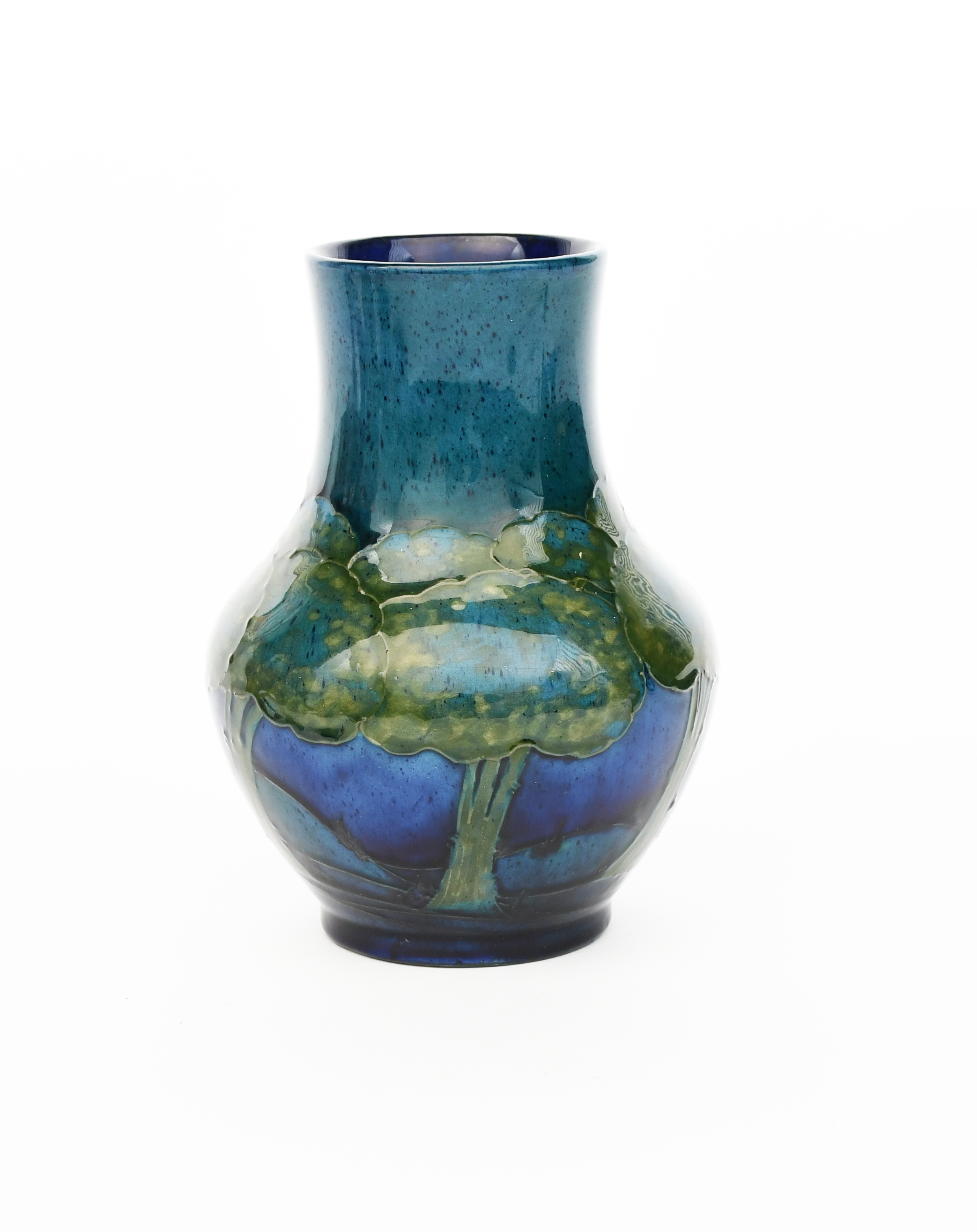 Moonlit Blue a Moorcroft Pottery vase designed by William Moorcroft, swollen cylindrical form, tubeline decorated with a frieze of trees in green and blue on a dark blue ground, impressed marks, painted blue signature, 16.5cm. high