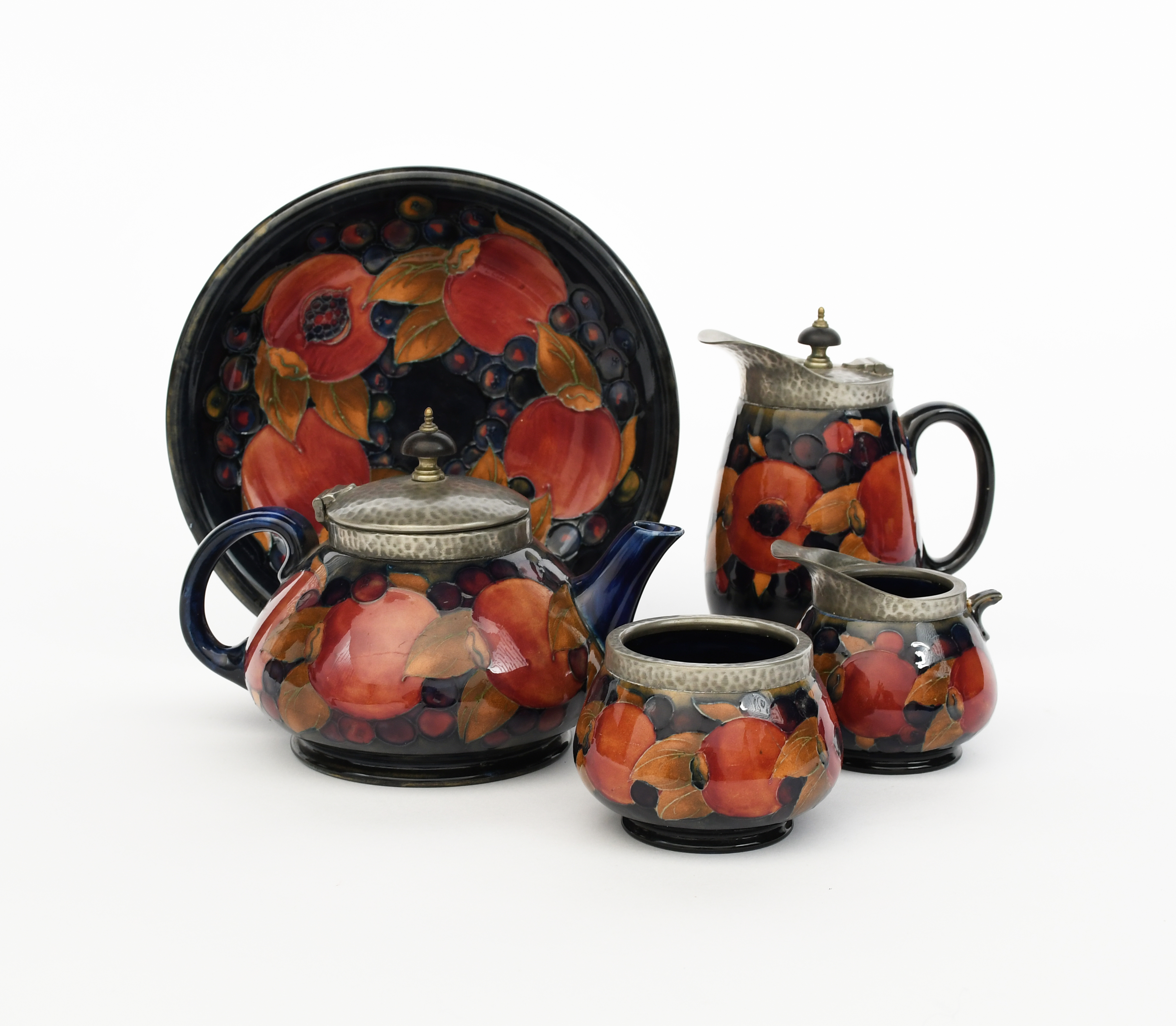 Pomegranate a Moorcroft Pottery and Tudric Pewter tea set designed by William Moorcroft, for retail by Liberty & Co, comprising, teapot and pewter cover, hot-water jug, milk-jug and sugar basin and a Pomegranate plate, impressed marks, painted blue signature, milk-jug broken handle, 13.5cm. high (teapot), (5)