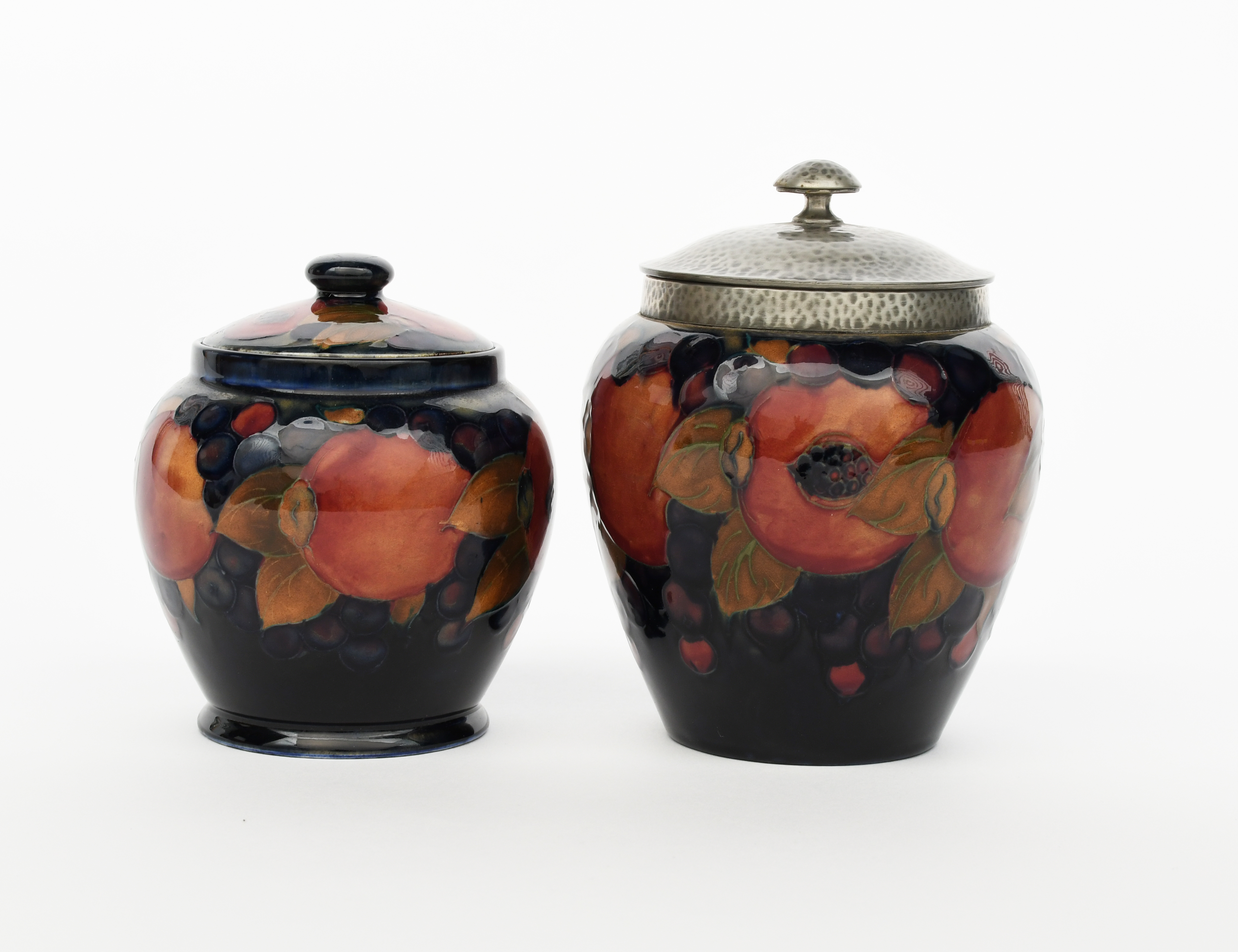 Pomegranate a Moorcroft Pottery Biscuit barrel with Tudric Pewter cover designed by William Moorcroft, for retail by Liberty & Co, painted in shades of red, purple, green and ochre on a blue ground, and a Moorcroft Pottery Pomegranate tobacco jar and cover, painted blue signature, paper label, 17cm. high, (4)